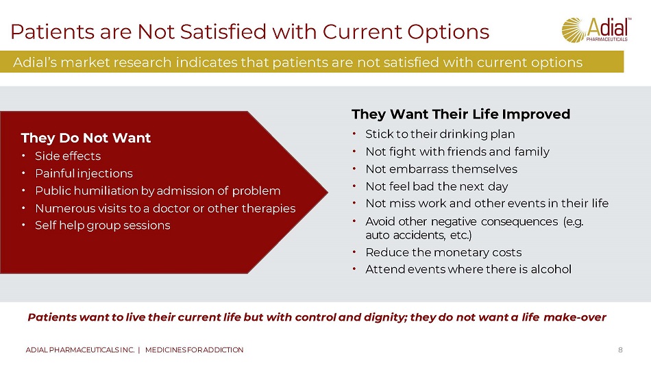 Current Market Solutions are Failing 7 ADIAL PHARMACEUTICALS INC. | MEDICINES FOR ADDICTION 20230322 Abstinence is often the only goal, and current therapies require abstinence prior to initiating therapy • Causes a mismatch between problem and solution • Abstinence requires dramatic changes and often serious work and social consequences Patients face extreme solutions • Req uire significant lifestyle changes – e.g., Abstinence – e.g., Vivitrol is injectable by physician • Need to avoid friends, family and social events • Social & professional damage for admitting problem Significant side effects of current therapies • Mental — Nausea, dizziness, psychiatric disorders and depressive symptoms • Physical — Vomiting, abdominal pain, arthritis and joint stiffness Data show that current therapeutic solutions are ineffective • 90% of patients do not achieve long - term abstinence • AUD largely goes untreated … fears of stigmatization and beliefs that treatment is ineffective may explain the lack of AUD treatment in the U.S. Abstinence Barrier Side Effect Barrier Efficacy Barrier Ease of Use & Stigmatization Barriers Sources: JAMA Psychiatry, Epidemiology of DSM - 5 AUD, 2015. Dodes, et. al., The Sober Truth: Debunking the Bad Science Behind 12 - Step Programs and the Rehab Industry, 2014 Major characteristics of current therapeutic approaches are significant barriers to patient adoption