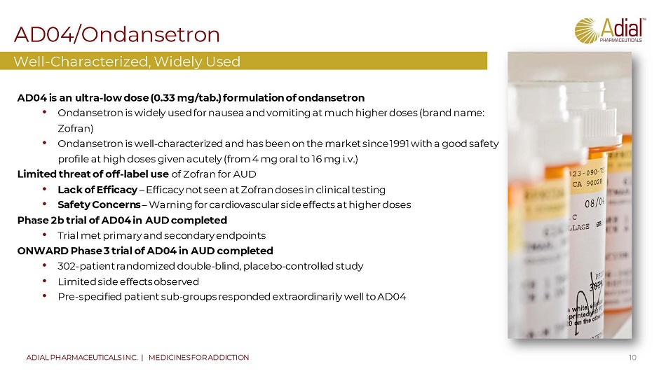 AD04 is believed to interfere with the dopamine reward system and lead to reduced alcohol intake Sources: Barnes, NM and Sharp, T, 1999; Dawes, MA et al., 2005b; Johnson, BA et al., 1993; Johnson, BA and Cowen, PJ, 1993; Lovinger , DM, 1991, 1999a; Swift, RM et al., 1996; Tomkins, DM et al., 1995 Novel Mechanism of Action for Treating AUD Studies suggest that blockade of serotonin - 3 receptors will influence the dopamine reward system activated by alcohol, decreasing dopamine release and attenuating alcohol craving s 9 ADIAL PHARMACEUTICALS INC. | MEDICINES FOR ADDICTION Reduced Serotonin - 3 Receptor Signaling D e c r e ased Cravings Reduced Release of Dopamine
