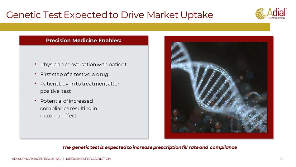 Designed to reduce craving in order to effectively curb alcohol intake Brings 20+ year record of acute clinical use with positive safety and tolerability profile Maximal patient compliance, ease of use & increased effect Ends need for abstinence, a major hurdle in starting & continuing pharmacologic therapy Takes treatment from detox clinics & group therapy - realizes patients’ desire of reduced drinking Companion genetic biomarker test identifies the patients likely to benefit from AD04 New M echanism Action (MOA) for treating AUD Good safety profile, high tolerability Oral daily dosing (twice - a - day now, once - a - day expected) Reduction of heavy drinking target indication Lowers the stigma of AUD and empowers the patient Genetic Tests for Precision Medicine Designed to address needs of patients who desire to control their drinking but cannot/will not undertak e abstinence or significant side effects 11 ADIAL PHARMACEUTICALS INC. | MEDICINES FOR ADDICTION AD04 is Designed to Meet the Market Need And Allow Management of Heavy Drinking