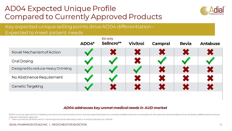 Genetic Test Expected to Drive Market Uptake 12 ADIAL PHARMACEUTICALS INC. | MEDICINES FOR ADDICTION The g enetic test is expected to increase prescription fill rate and compliance • Physician conversation with patient • First step of a test vs. a drug • Patient buy - in to treatment after positive test • Potential of increased compliance resulting in maximal effect Precision Medicine Enables:
