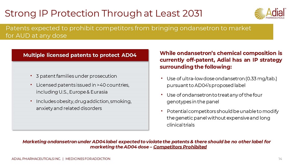 AD04 addresses key unmet medical needs in AUD market *AD04 is not yet approved for marketing and product characteristics shown as those expected based on currently available data and current plans. In all cases, the characteristics shown are fully qualified based on future data and regulatory approval. ** Taken as needed; all others are on a time regiment of at least daily or are a monthly injection (i.e. Vivitrol). . A DO 4 * EU only S e l in c r o * * V iv i tr o l C a m p ral R e v i a A nta b us e Novel Mechanism of Action Oral Dosing Designed to reduce Heavy Drinking No Abstinence Requirement Genetic Targeting 13 ADIAL PHARMACEUTICALS INC. | MEDICINES FOR ADDICTION AD04 Expected Unique Profile Compared to Currently Approved Products Key expected unique selling points drive AD04 differentiation – Expected to meet patient needs