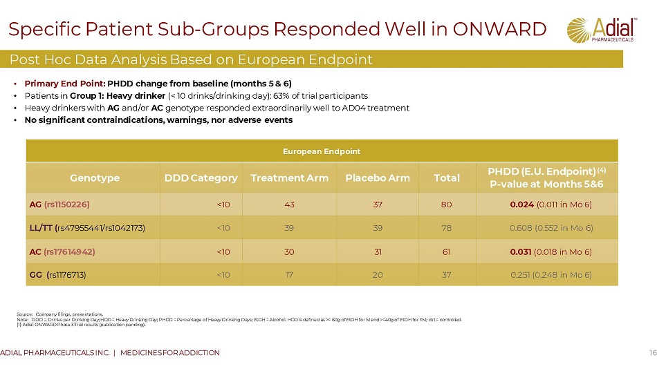ONWARD Phase 3 Study Conducted in Europe 15 ADIAL PHARMACEUTICALS INC. | MEDICINES FOR ADDICTION • Randomized, double - blind, placebo - c ontrolled , parallel - group multicenter study • Patients were screened for the appropriate genotypes via an inexpensive, standard blood test to determine eligibility for treatment with AD04 • Primary End Point: PHDD change from baseline (months 5 & 6) • Eligibility Criteria (n=302) Trial design Source: Company filings, presentations. Note: DDD = Drinks per Drinking Day; HDD = Heavy Drinking Day; PHDD = Percentage of Heavy Drinking Days; EtOH = Alcohol. HDD is defined as >= 60g of EtOH for M and >=40g of EtOH for FM; ctrl = controlled. (1) Adial ONWARD Phase 3 Trial results (publication pending). • ≥6 HDDs in 4 weeks prior to Baseline Visit • ≥40g EtOH per day for males or ≥20g EtOH for females 4 weeks prior to Screening Visit • ≤14 consecutive abstinent days • DSM - V Moderate - or Severe - AUD • No withdrawal symptoms • No in n or out - patient treatment w/in 28 days prior to Baseline V i sit Conducted in six countries in Central/Eastern Europe Group 1: Heavy drinker (< 10 drinks/drinking day): ~63% of trial participants Group 2: Very heavy drinker (> 10 drinks/drinking day: ~37% of trial participants 37% 63% Very Heavy Drinker Heavy Drinker
