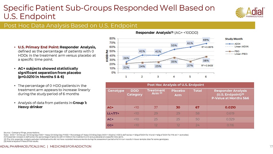 Specific Patient Sub - Groups Responded Well in ONWARD 16 ADIAL PHARMACEUTICALS INC. | MEDICINES FOR ADDICTION Post Hoc Data Analysis Based on European Endpoint E uropean Endpoint PHDD (E . U . Endpoint) (4) P - value at Months 5&6 Total Placebo Arm Treatment Arm DDD Category Genotype 0.024 (0.011 in Mo 6) 80 37 43 <10 AG (rs1150226) 0.608 (0.552 in Mo 6) 78 39 39 <10 LL/TT ( rs47955441/rs1042173) 0.031 (0.018 in Mo 6) 61 31 30 <10 AC (rs17614942) 0.251 (0.248 in Mo 6) 37 20 17 <10 GG ( rs1176713) Source: Company filings, presentations. Note: DDD = Drinks per Drinking Day; HDD = Heavy Drinking Day; PHDD = Percentage of Heavy Drinking Days; EtOH = Alcohol. HDD is defined as >= 60g of EtOH for M and >=40g of EtOH for FM; ctrl = controlled. (1) Adial ONWARD Phase 3 Trial results (publication pending). • Primary End Point: PHDD change from baseline (months 5 & 6) • Patients in Group 1: Heavy drinker (< 10 drinks/drinking day): 63% of trial participants • Heavy drinkers with AG and/or AC genotype responded extraordinarily well to AD04 treatment • No significant contraindications, warnings, nor adverse events