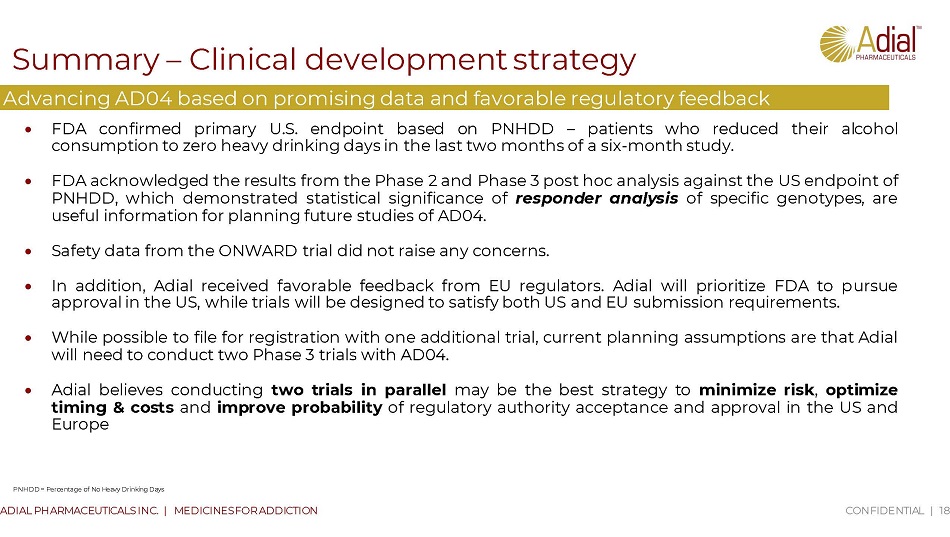 Specific Patient Sub - Groups Responded Well Based on U.S. Endpoint 17 ADIAL PHARMACEUTICALS INC. | MEDICINES FOR ADDICTION Post Hoc Data Analysis Based on U.S. Endpoint Post Hoc Analysis of U.S. Endpoint Responder Analysis (U.S. Endpoint) (3) P - Value at Months 5&6 Total Placebo Arm Treatment Arm (2) DDD Category Genotype 0.02 1 0 67 30 37 <10 AG+ 0. 619 58 29 29 <10 LL+/TT+ 0. 329 50 25 25 <10 AC+ 0. 116 24 12 12 <10 GG+ Responder Analysis (1) (AG+ <10DDD) • U.S. Primary End Point: Responder Analysis, defined as the percentage of patients with 0 HDDs in the treatment arm versus placebo at a specific time point. • AG+ subjects showed statistically significant separation from placebo (p=0.02 1 0 in Months 5 & 6 ) • The percentage of 0 HDD patients in the treatment arm appears to increase linearly during the study period of 6 months • Analysis of data from patients in Group 1: Heavy drinker Source: Company filings, presentations. Note: DDD = Drinks per Drinking Day; HDD = Heavy Drinking Day; PHDD = Percentage of Heavy Drinking Days; EtOH = Alcohol. HDD is defined as >= 60g of EtOH for M and >=40g of EtOH for FM; ctrl = controlled. (1) R esponder analysis is defined as the percentage of patients with 0 HDDs in the treatment arm versus placebo at a specific time point. (2) The U.S. responder analysis excludes individuals who did not have recorded measurements during the assessment period which in turn results in lower sample sizes for some genotypes. (3) Adial analysis of Phase 3 Trial results.