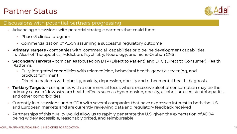 Summary – Clinical development strategy CONFIDENTIAL | 18 ADIAL PHARMACEUTICALS INC. | MEDICINES FOR ADDICTION Advancing AD04 based on promising data and favorable regulatory feedback FDA confirmed primary U . S . endpoint based on PNHDD – patients who reduced their alcohol consumption to zero heavy drinking days in the last two months of a six - month study . FDA acknowledged the results from the Phase 2 and Phase 3 post hoc analysis against the US endpoint of PNHDD, which demonstrated statistical significance of responder analysis of specific genotypes, are useful information for planning future studies of AD 04 . Safety data from the ONWARD trial did not raise any concerns . In addition, Adial received favorable feedback from EU regulators . Adial will prioritize FDA to pursue approval in the US, while trials will be designed to satisfy both US and EU submission requirements . While possible to file for registration with one additional trial, current planning assumptions are that Adial will need to conduct two Phase 3 trials with AD 04 . Adial believes conducting two trials in parallel may be the best strategy to minimize risk , optimize timing & costs and improve probability of regulatory authority acceptance and approval in the US and Europe P N HDD = Percentage of No Heavy Drinking Days