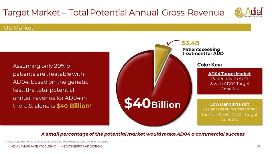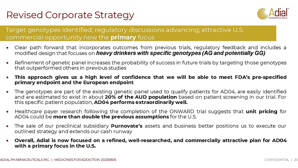 Revised Corporate Strategy CONFIDENTIAL | 20 ADIAL PHARMACEUTICALS INC. | MEDICINES FOR ADDICTION 20230606 Target genotypes identified; regulatory discussions advancing; attractive U.S. commercial opportunity now the primary focus Clear path forward that incorporates outcomes from previous trials, regulatory feedback and includes a modified design that focuses on heavy drinkers with specific genotypes (AG and potentially GG) Refinement of genetic panel increases the probability of success in future trials by targeting those genotypes that outperformed others in previous studies This approach gives us a high level of confidence that we will be able to meet FDA’s pre - specified primary endpoint and the European endpoint The genotypes are part of the existing genetic panel used to qualify patients for AD 04 , are easily identified and are estimated to exist in about 20 % of the AUD population based on patient screening in our trial . For this specific patient population, AD 04 performs extraordinarily well . Healthcare payer research following the completion of the ONWARD trial suggests that unit pricing for AD 04 could be more than double the previous assumptions for the U . S . The sale of our preclinical subsidiary Purnovate’s assets and business better positions us to execute our outlined strategy and extends our cash runway Overall, Adial is now focused on a refined, well - researched, and commercially attractive plan for AD 04 with a primary focus in the U . S .