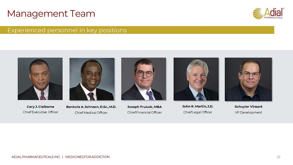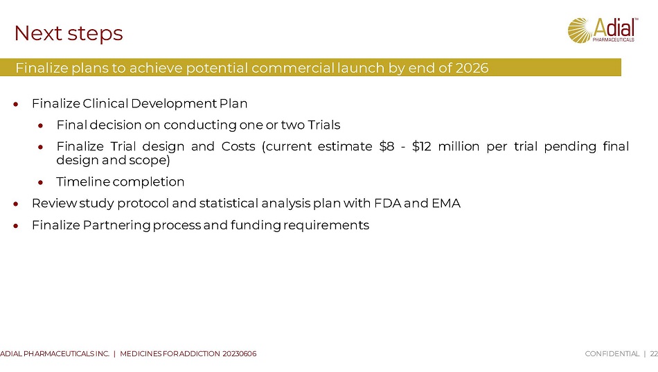 Next steps CONFIDENTIAL | 22 ADIAL PHARMACEUTICALS INC. | MEDICINES FOR ADDICTION 20230606 Finalize plans to achieve potential commercial launch by end of 2026 Finalize Clinical Development Plan Final decision on conducting one or two Trials Finalize Trial design and Costs (current estimate $ 8 - $ 12 million per trial pending final design and scope) Timeline completion Review study protocol and statistical analysis plan with FDA and EMA Finalize Partnering process and funding requirements