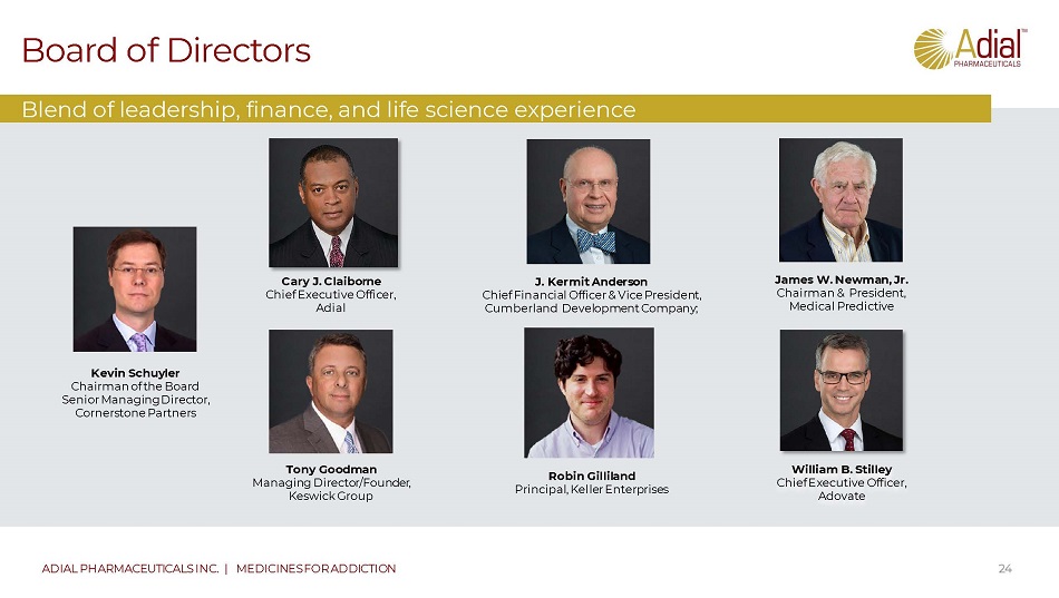 Management Team 23 ADIAL PHARMACEUTICALS INC. | MEDICINES FOR ADDICTION Experienced personnel in key positions Joseph Truluck , MBA C hief F inancial O fficer Bankole A. Johnson, D.Sc., M.D. C hief Medical Officer Cary J. Claiborne Chief Executive Officer John R. Martin, J.D. Chief Legal Officer Schuyler Vinzant VP Development
