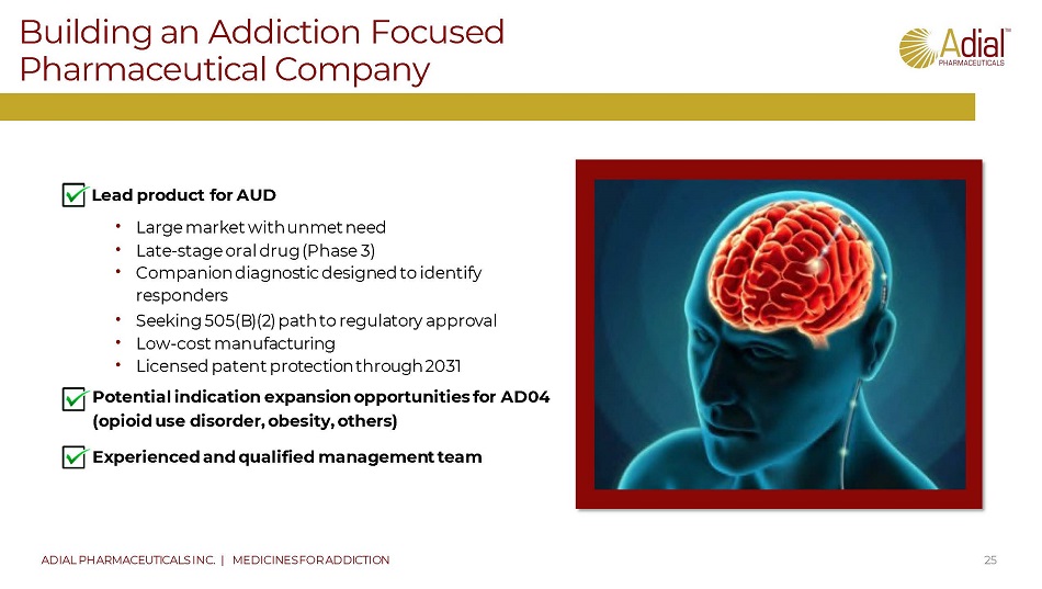 Board of Directors 24 ADIAL PHARMACEUTICALS INC. | MEDICINES FOR ADDICTION Blend of leadership, finance, and life science experience Tony Goodman Managing Director/Founder, Keswick Group Cary J. Claiborne Chief Executive Officer, Adial Kevin Schuyler Chairman of the Board Senior Managing Director, Cornerstone Partners J. Kermit Anderson Chief Financial Officer & Vice President, Cumberland Development Company; Robin Gilliland Principal, Keller Enterprises James W. Newman, Jr. Chairman & President, Medical Predictive William B. Stilley Chief Executive Officer, Adovate