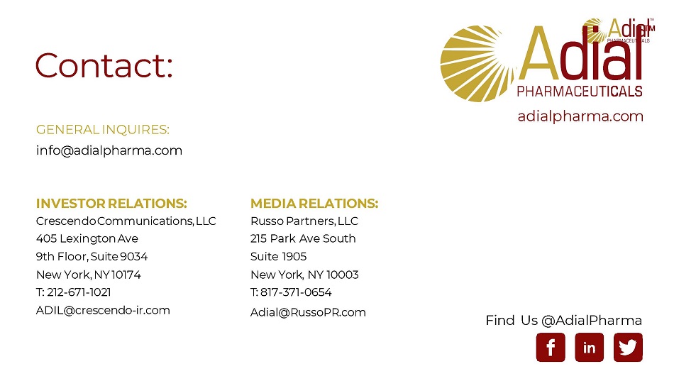 C o n t a c t : GENERAL INQUIRES : info@adialpharma.com INVESTOR RELATIONS : Crescendo Communications, LLC 405 Lexington Ave 9th Floor, Suite 9034 New York, NY 10174 T: 212 - 671 - 1021 ADIL@crescendo - ir.com F ind U s @ A dial P harma adialpharma.com MEDIA RELATIONS : Russo Partners , LLC 215 Park Ave South Suite 1905 New York, NY 1000 3 T: 817 - 371 - 0654 Adial@RussoPR.com