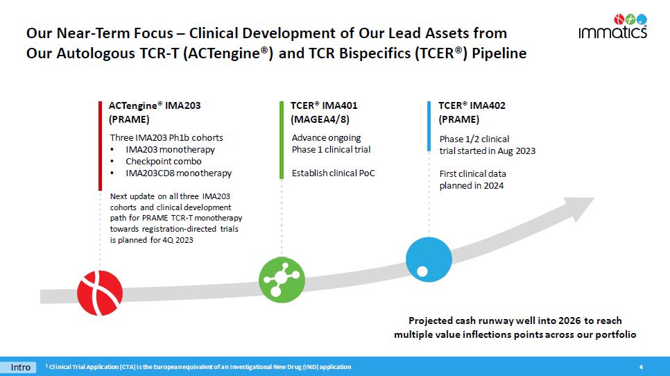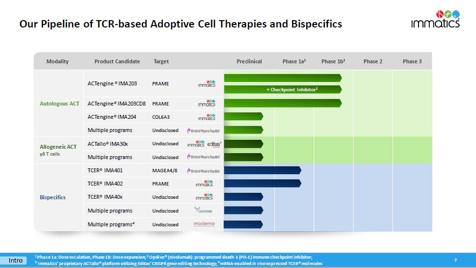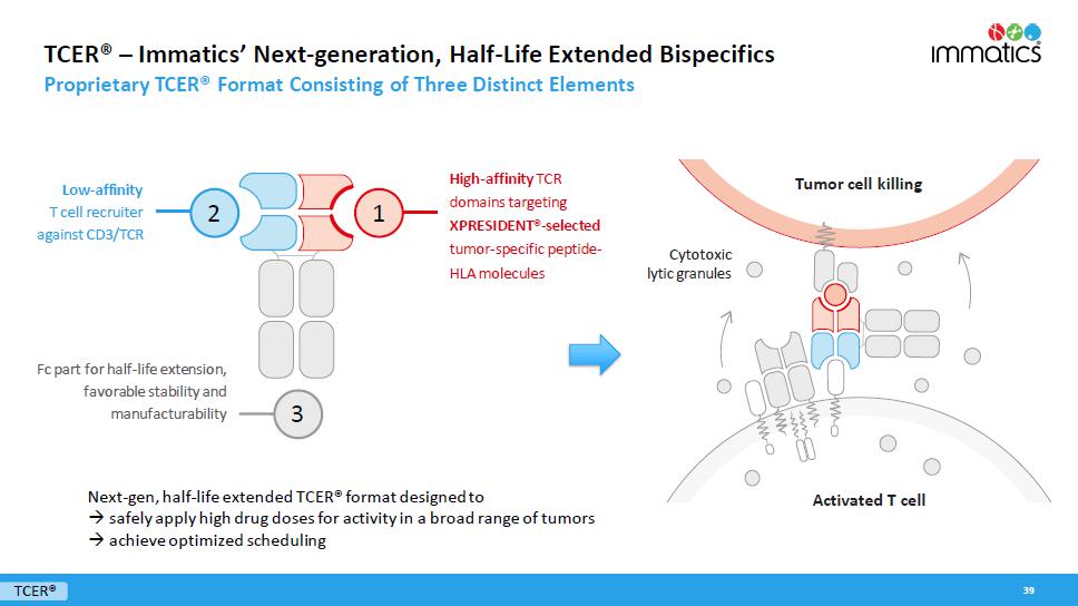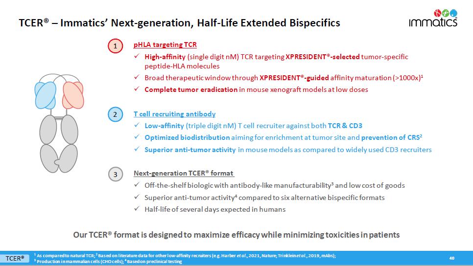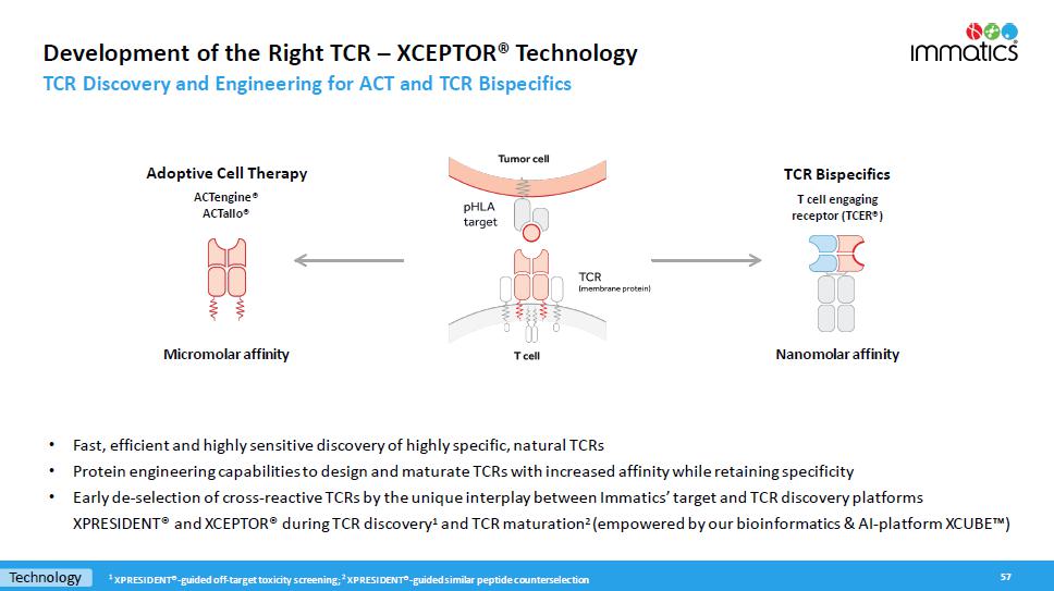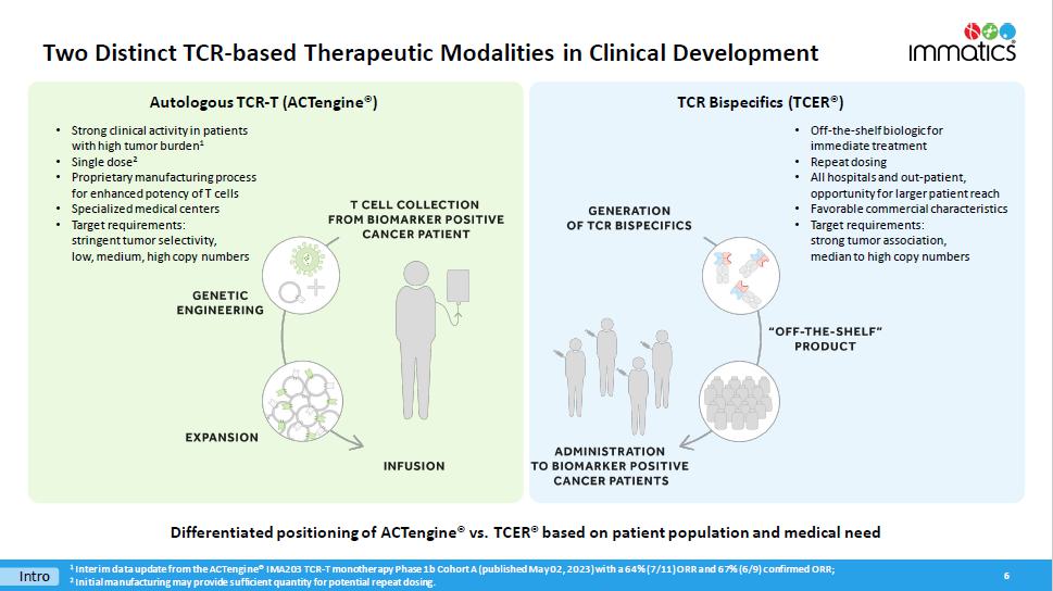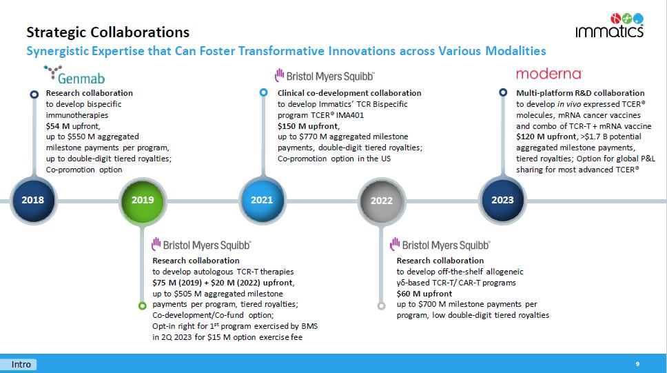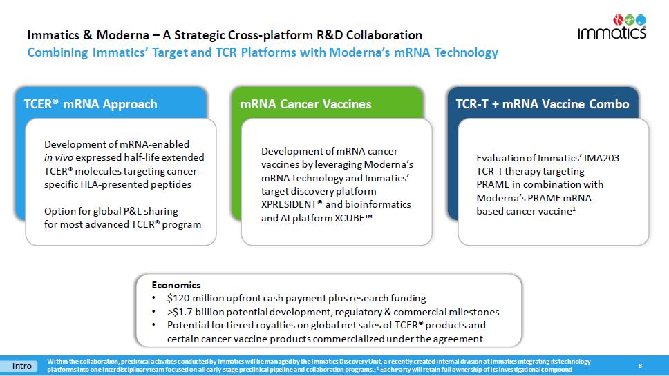 With respect to the TCER Program, pursuant to the Master Collaboration and License Agreement and the TCER Collaboration Project Agreement between the parties (the “TCER Project Agreement”), the parties will conduct the TCER Program for the research and development of TCERs with respect to HLA-presented peptide targets derived from an agreed upon number of proteins selected by Moderna. Immatics will be responsible for, and be reimbursed the cost of, TCER identification, validation and engineering to generate the applicable TCER sequence and preclinical studies in accordance with the applicable mutually agreed research plan, while Moderna will be responsible for, and bear the cost of, developing, manufacturing and commercializing the applicable products containing or comprising such TCERs; provided that Immatics has a right to co-fund the development and commercialization of certain products by making an opt-in payment in exchange for profit and loss sharing on such products. Immatics will grant to Moderna an exclusive, worldwide sublicensable license to develop, manufacture and commercialize any product (or that contain any product) developed under the TCER Project Agreement. For each target, depending on certain product characteristics, Immatics may be eligible to receive milestone payments of up to a mid-eight-digit amount upon the achievement of certain development milestones and up to a mid-nine-digit amount upon the achievement of certain regulatory and commercial milestones. In addition, during the royalty term (as described below) and depending on certain product characteristics, Immatics will be eligible to receive tiered, mid-single-digit to low-double-digit percentage royalties on worldwide net sales of the applicable product, which royalty percentages are subject to reduction in a given country under certain circumstances. A royalty term with respect to a product under the TCER Program in a given country begins upon the first commercial sale of such product in such country and terminates on the latest of the expiration of regulatory exclusivity, the expiration of valid patent claims covering such product, and 10 years after first commercial sale of the product in a given country. The TCER Project Agreement will expire upon expiration of the last royalty term contemplated by the TCER Project Agreement. During the term of the TCER Program, Immatics has certain exclusivity and notification obligations to Moderna, and its ability to develop, manufacture and commercialize certain cell therapy products that bind to the targets subject to the TCER Project Agreement is limited by the TCER Project Agreement.