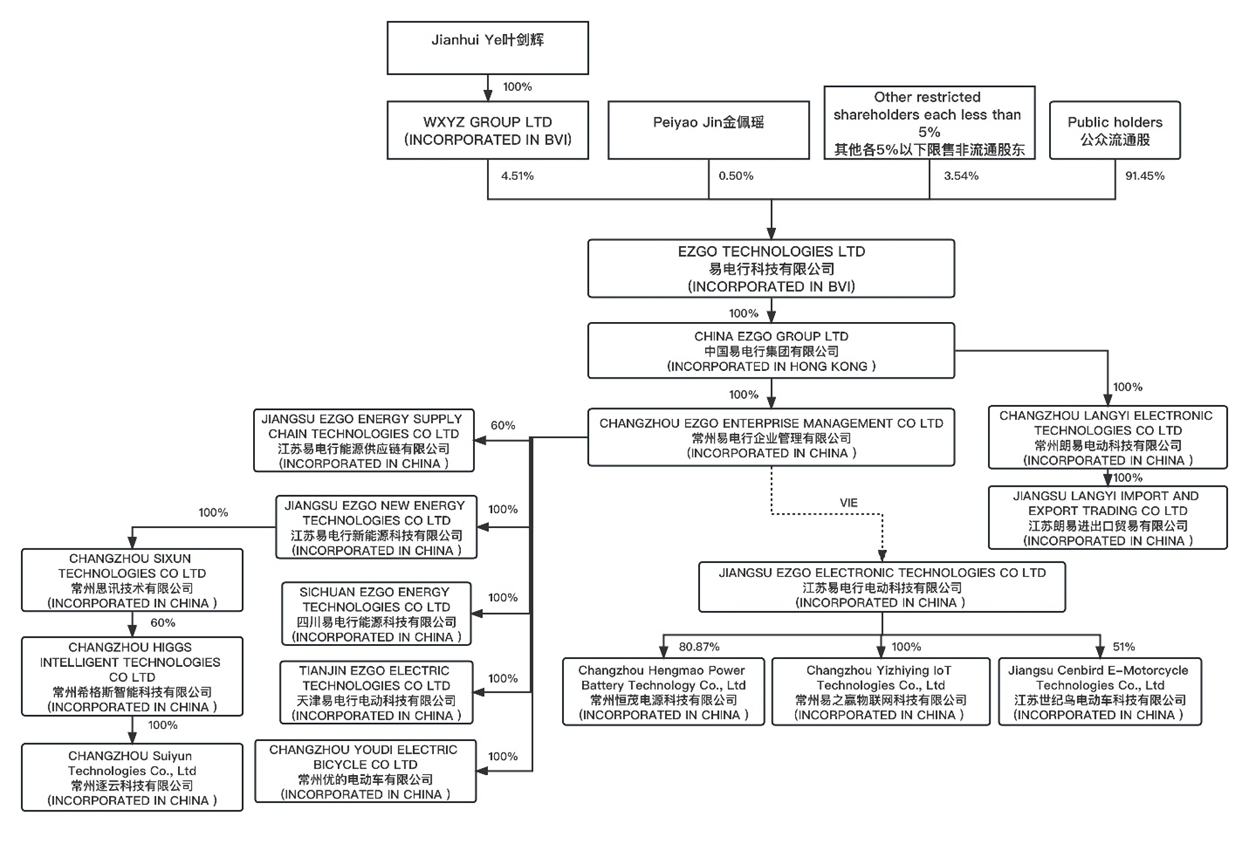 The diagram below shows our corporate structure as of the date of this prospectus supplement, including the VIE and its subsidiaries. However, investors are cautioned that the enforceability of such VIE Agreements has not been tested in a court of law. EZGO conducts operations in China primarily through the VIE and its subsidiaries in China, and EZGO does not conduct any business on its own. The VIE structure is used to provide investors with contractual exposure to foreign investment in China-based companies where Chinese law prohibits or restricts direct foreign investment in the operating companies. Due to PRC legal restrictions on foreign ownership in internet-based businesses, we do not have any equity ownership of the VIE, instead we receive the economic benefits of the VIE’s business operations through certain contractual arrangements. As a result of such series of contractual arrangements, EZGO and its subsidiaries become the primary beneficiary of the VIE for accounting purposes and the VIE as a PRC consolidated entity under U.S. GAAP. We consolidate the financial results of the VIE and its subsidiaries in our consolidated financial statements in accordance with U.S. GAAP. Neither we nor EZGO’s investors own any equity ownership in, direct foreign investment in, or control through such ownership/investment of the VIE. Investors are purchasing an interest in EZGO, the BVI holding company.