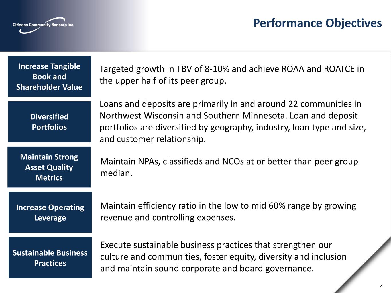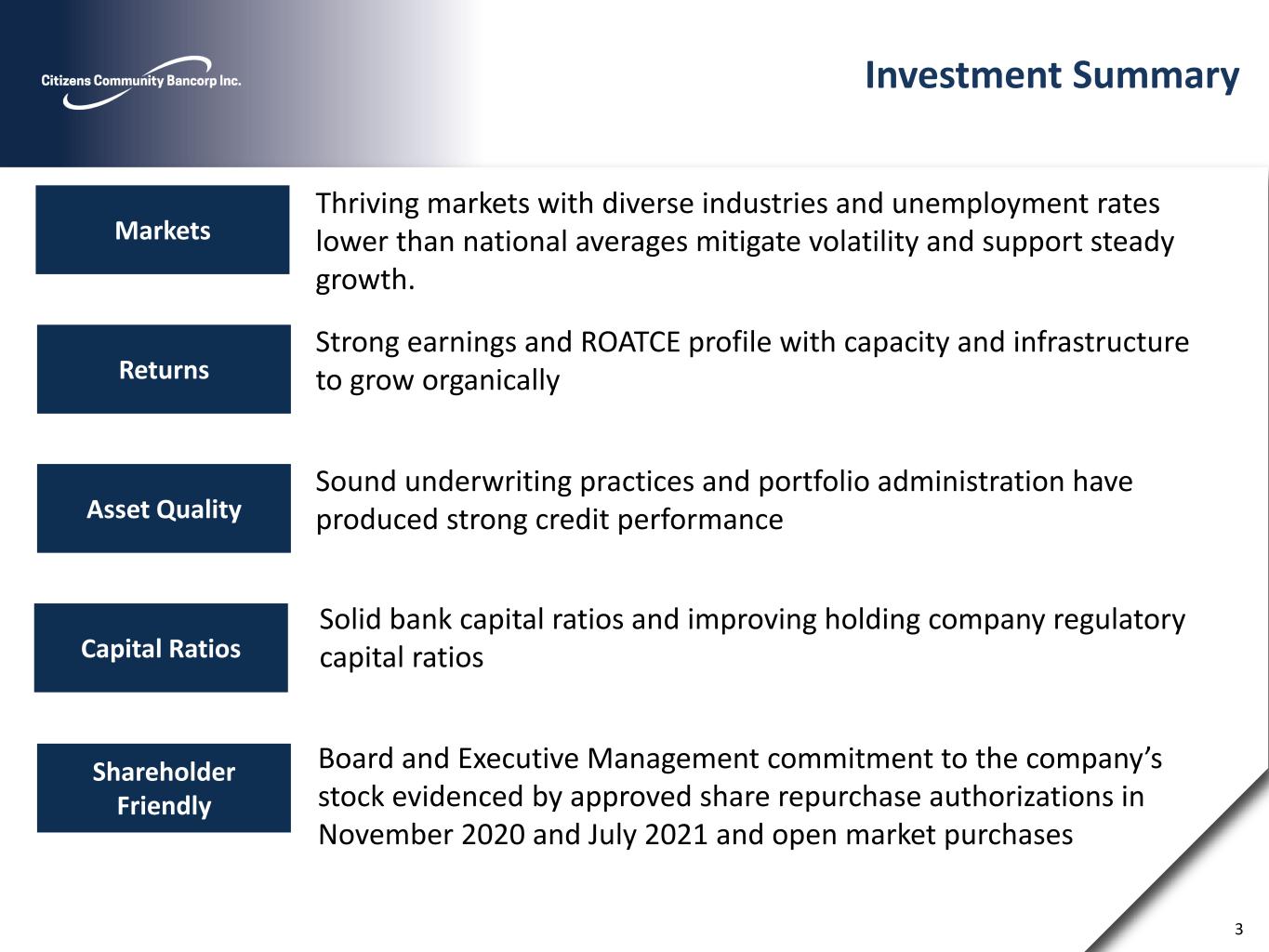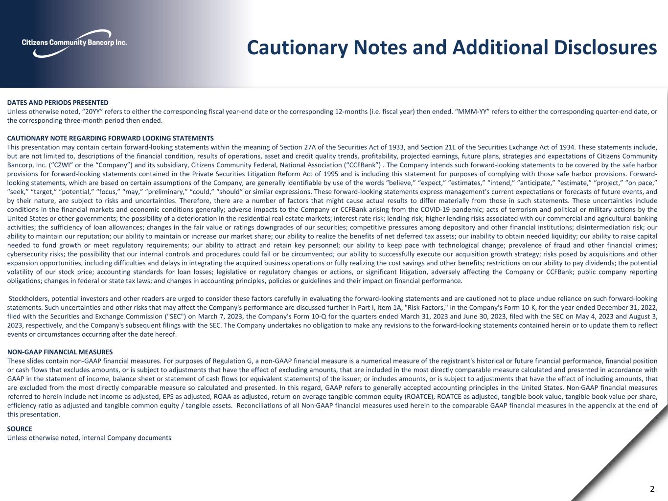 Cautionary Notes and Additional Disclosures 2 DATES AND PERIODS PRESENTED Unless otherwise noted, “20YY” refers to either the corresponding fiscal year-end date or the corresponding 12-months (i.e. fiscal year) then ended. “MMM-YY” refers to either the corresponding quarter-end date, or the corresponding three-month period then ended. CAUTIONARY NOTE REGARDING FORWARD LOOKING STATEMENTS This presentation may contain certain forward-looking statements within the meaning of Section 27A of the Securities Act of 1933, and Section 21E of the Securities Exchange Act of 1934. These statements include, but are not limited to, descriptions of the financial condition, results of operations, asset and credit quality trends, profitability, projected earnings, future plans, strategies and expectations of Citizens Community Bancorp, Inc. (“CZWI” or the “Company”) and its subsidiary, Citizens Community Federal, National Association (“CCFBank”) . The Company intends such forward-looking statements to be covered by the safe harbor provisions for forward-looking statements contained in the Private Securities Litigation Reform Act of 1995 and is including this statement for purposes of complying with those safe harbor provisions. Forward- looking statements, which are based on certain assumptions of the Company, are generally identifiable by use of the words “believe,” “expect,” “estimates,” “intend,” “anticipate,” “estimate,” “project,” “on pace,” “seek,” “target,” “potential,” “focus,” “may,” “preliminary,” “could,” “should” or similar expressions. These forward-looking statements express management’s current expectations or forecasts of future events, and by their nature, are subject to risks and uncertainties. Therefore, there are a number of factors that might cause actual results to differ materially from those in such statements. These uncertainties include conditions in the financial markets and economic conditions generally; adverse impacts to the Company or CCFBank arising from the COVID-19 pandemic; acts of terrorism and political or military actions by the United States or other governments; the possibility of a deterioration in the residential real estate markets; interest rate risk; lending risk; higher lending risks associated with our commercial and agricultural banking activities; the sufficiency of loan allowances; changes in the fair value or ratings downgrades of our securities; competitive pressures among depository and other financial institutions; disintermediation risk; our ability to maintain our reputation; our ability to maintain or increase our market share; our ability to realize the benefits of net deferred tax assets; our inability to obtain needed liquidity; our ability to raise capital needed to fund growth or meet regulatory requirements; our ability to attract and retain key personnel; our ability to keep pace with technological change; prevalence of fraud and other financial crimes; cybersecurity risks; the possibility that our internal controls and procedures could fail or be circumvented; our ability to successfully execute our acquisition growth strategy; risks posed by acquisitions and other expansion opportunities, including difficulties and delays in integrating the acquired business operations or fully realizing the cost savings and other benefits; restrictions on our ability to pay dividends; the potential volatility of our stock price; accounting standards for loan losses; legislative or regulatory changes or actions, or significant litigation, adversely affecting the Company or CCFBank; public company reporting obligations; changes in federal or state tax laws; and changes in accounting principles, policies or guidelines and their impact on financial performance. Stockholders, potential investors and other readers are urged to consider these factors carefully in evaluating the forward-looking statements and are cautioned not to place undue reliance on such forward-looking statements. Such uncertainties and other risks that may affect the Company's performance are discussed further in Part I, Item 1A, "Risk Factors," in the Company's Form 10-K, for the year ended December 31, 2022, filed with the Securities and Exchange Commission ("SEC") on March 7, 2023, the Company’s Form 10-Q for the quarters ended March 31, 2023 and June 30, 2023, filed with the SEC on May 4, 2023 and August 3, 2023, respectively, and the Company's subsequent filings with the SEC. The Company undertakes no obligation to make any revisions to the forward-looking statements contained herein or to update them to reflect events or circumstances occurring after the date hereof. NON-GAAP FINANCIAL MEASURES These slides contain non-GAAP financial measures. For purposes of Regulation G, a non-GAAP financial measure is a numerical measure of the registrant's historical or future financial performance, financial position or cash flows that excludes amounts, or is subject to adjustments that have the effect of excluding amounts, that are included in the most directly comparable measure calculated and presented in accordance with GAAP in the statement of income, balance sheet or statement of cash flows (or equivalent statements) of the issuer; or includes amounts, or is subject to adjustments that have the effect of including amounts, that are excluded from the most directly comparable measure so calculated and presented. In this regard, GAAP refers to generally accepted accounting principles in the United States. Non·GAAP financial measures referred to herein include net income as adjusted, EPS as adjusted, ROAA as adjusted, return on average tangible common equity (ROATCE), ROATCE as adjusted, tangible book value, tangible book value per share, efficiency ratio as adjusted and tangible common equity / tangible assets. Reconciliations of all Non·GAAP financial measures used herein to the comparable GAAP financial
