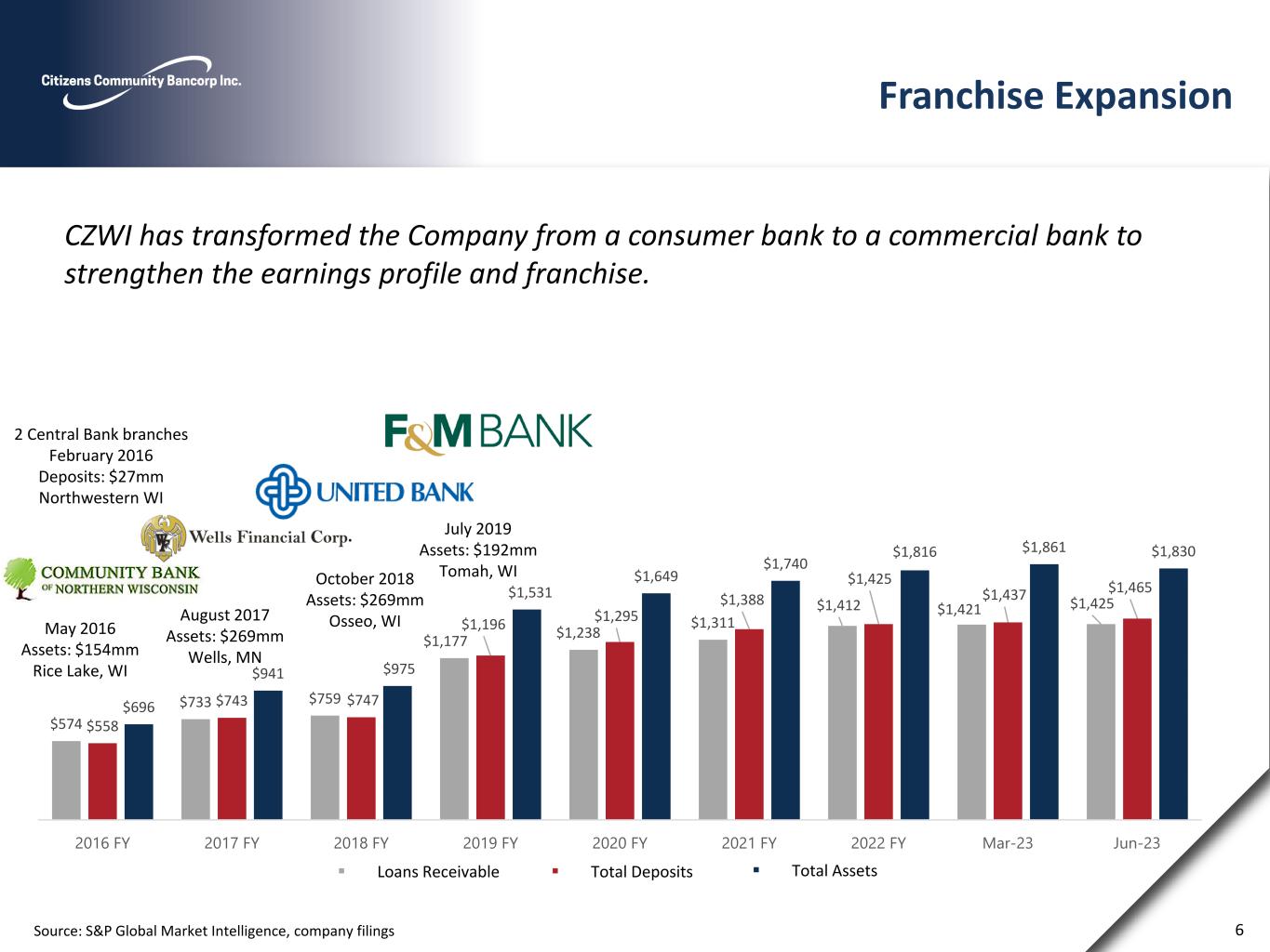 Operating Market Overview CZWI Operates in diverse markets within the northwestern region of Wisconsin, metro Twin Cities and the Mankato, Minnesota MSA Source: S&P Global Market Intelligence 0 0 0 0 0 5