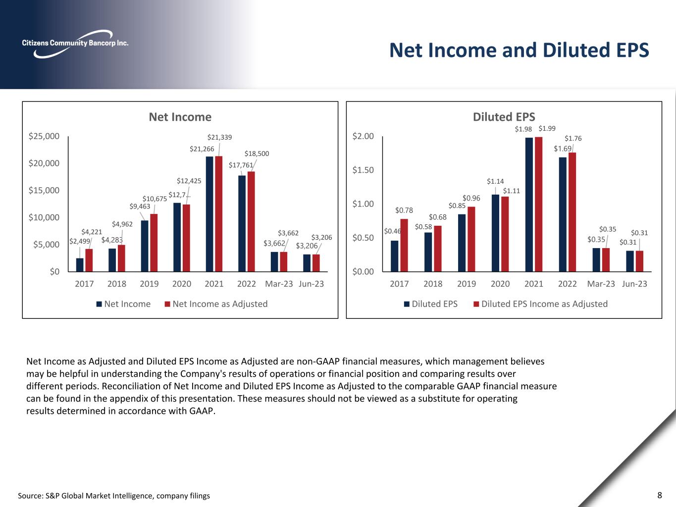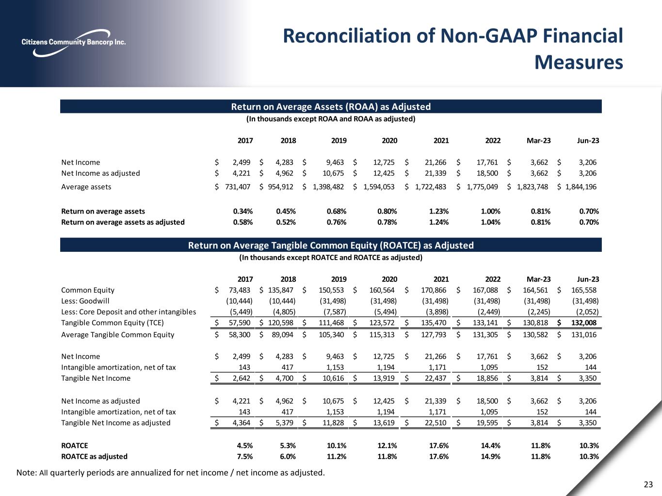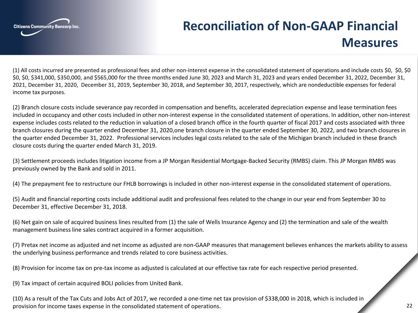 (1) All costs incurred are presented as professional fees and other non-interest expense in the consolidated statement of operations and include costs $0, $0, $0 $0, $0, $341,000, $350,000, and $565,000 for the three months ended June 30, 2023 and March 31, 2023 and years ended December 31, 2022, December 31, 2021, December 31, 2020, December 31, 2019, September 30, 2018, and September 30, 2017, respectively, which are nondeductible expenses for federal income tax purposes. (2) Branch closure costs include severance pay recorded in compensation and benefits, accelerated depreciation expense and lease termination fees included in occupancy and other costs included in other non-interest expense in the consolidated statement of operations. In addition, other non-interest expense includes costs related to the reduction in valuation of a closed branch office in the fourth quarter of fiscal 2017 and costs associated with three branch closures during the quarter ended December 31, 2020,one branch closure in the quarter ended September 30, 2022, and two branch closures in the quarter ended December 31, 2022. Professional services includes legal costs related to the sale of the Michigan branch included in these Branch closure costs during the quarter ended March 31, 2019. (3) Settlement proceeds includes litigation income from a JP Morgan Residential Mortgage-Backed Security (RMBS) claim. This JP Morgan RMBS was previously owned by the Bank and sold in 2011. (4) The prepayment fee to restructure our FHLB borrowings is included in other non-interest expense in the consolidated statement of operations. (5) Audit and financial reporting costs include additional audit and professional fees related to the change in our year end from September 30 to December 31, effective December 31, 2018. (6) Net gain on sale of acquired business lines resulted from (1) the sale of Wells Insurance Agency and (2) the termination and sale of the wealth management business line sales contract acquired in a former acquisition. (7) Pretax net income as adjusted and net income as adjusted are non-GAAP measures that management believes enhances the markets ability to assess the underlying business performance and trends related to core business activities. (8) Provision for income tax on pre-tax income as adjusted is calculated at our effective tax rate for each respective period presented. (9) Tax impact of certain acquired BOLI policies from United Bank. (10) As a result of the Tax Cuts and Jobs Act of 2017, we recorded a one-time net tax provision of $338,000 in 2018, which is included in provision for income taxes expense in the consolidated statement of operations. 22 Reconciliation of Non-GAAP Financial Measures