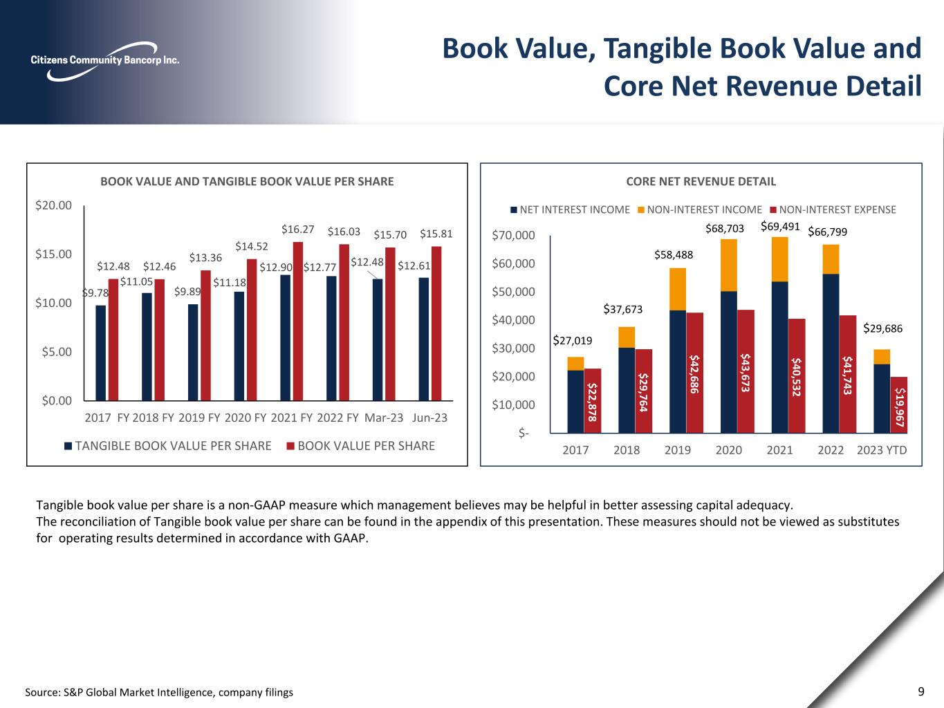 Net Income and Diluted EPS Source: S&P Global Market Intelligence, company filings Net Income as Adjusted and Diluted EPS Income as Adjusted are non-GAAP financial measures, which management believes may be helpful in understanding the Company's results of operations or financial position and comparing results over different periods. Reconciliation of Net Income and Diluted EPS Income as Adjusted to the comparable GAAP financial measure can be found in the appendix of this presentation. These measures should not be viewed as a substitute for operating results determined in accordance with GAAP. 8 $2,499 $4,283 $9,463 $12,7… $21,266 $17,761 $3,662 $3,206 $4,221 $4,962 $10,675 $12,425 $21,339 $18,500 $3,662 $3,206 $0 $5,000 $10,000 $15,000 $20,000 $25,000 2017 2018 2019 2020 2021 2022 Mar-23 Jun-23 Net Income Net Income Net Income as Adjusted $0.46 $0.58 $0.85 $1.14 $1.98 $1.69 $0.35 $0.31 $0.78 $0.68 $0.96 $1.11 $1.99 $1.76 $0.35 $0.31 $0.00 $0.50 $1.00 $1.50 $2.00 2017 2018 2019 2020 2021 2022 Mar-23 Jun-23 Diluted EPS Diluted EPS Diluted EPS Income as Adjusted