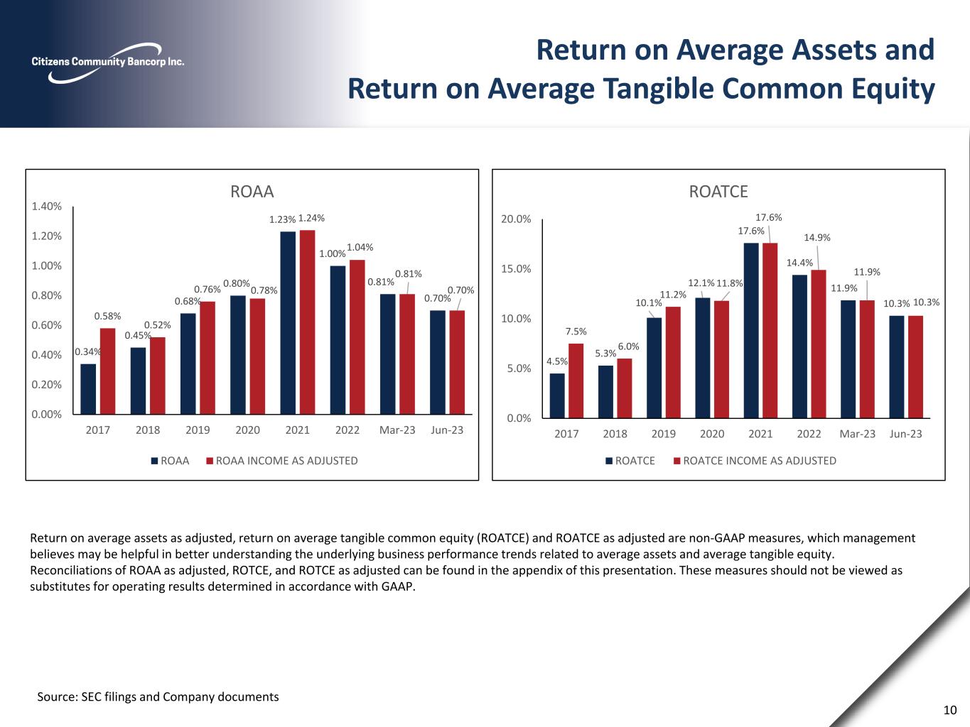 Book Value, Tangible Book Value and Core Net Revenue Detail Source: S&P Global Market Intelligence, company filings Tangible book value per share is a non-GAAP measure which management believes may be helpful in better assessing capital adequacy. The reconciliation of Tangible book value per share can be found in the appendix of this presentation. These measures should not be viewed as substitutes for operating results determined in accordance with GAAP. 9 $9.78 $11.05 $9.89 $11.18 $12.90 $12.77 $12.48 $12.61$12.48 $12.46 $13.36 $14.52 $16.27 $16.03 $15.70 $15.81 $0.00 $5.00 $10.00 $15.00 $20.00 2017 FY 2018 FY 2019 FY 2020 FY 2021 FY 2022 FY Mar-23 Jun-23 BOOK VALUE AND TANGIBLE BOOK VALUE PER SHARE TANGIBLE BOOK VALUE PER SHARE BOOK VALUE PER SHARE $22,878 $29,764 $42,686 $43,673 $40,532 $41,743 $- $10,000 $20,000 $30,000 $40,000 $50,000 $60,000 $70,000 2017 2018 2019 2020 2021 2022 2023 YTD CORE NET REVENUE DETAIL NET INTEREST INCOME NON-INTEREST INCOME NON-INTEREST EXPENSE $58,488 $68,703 $69,491 $27,019 $37,673 $66,799 $29,686 $19,967