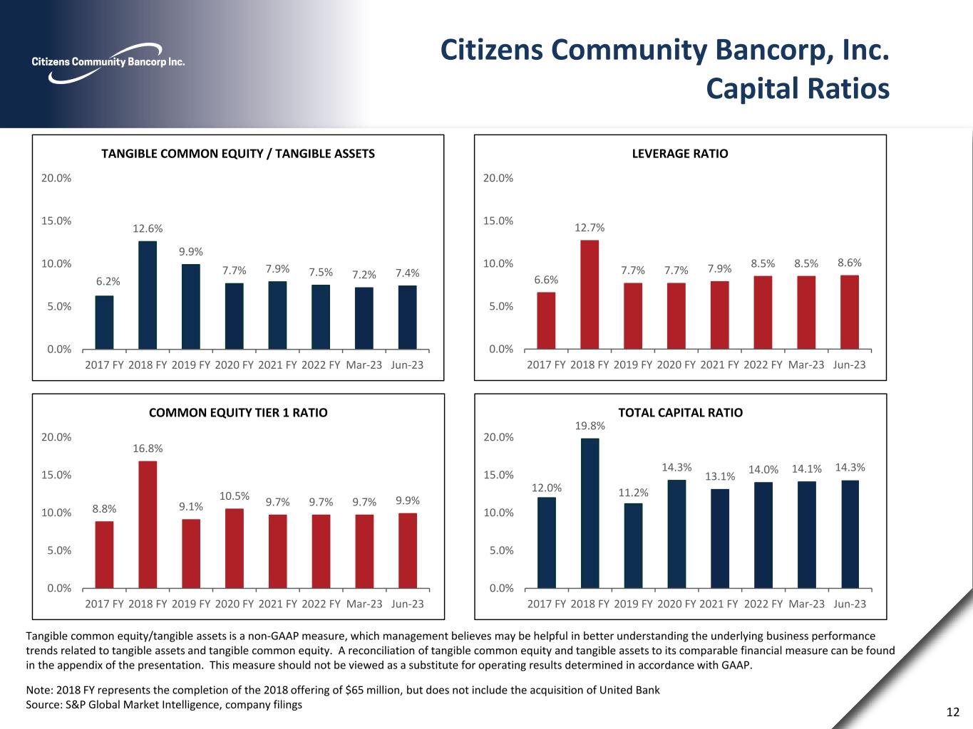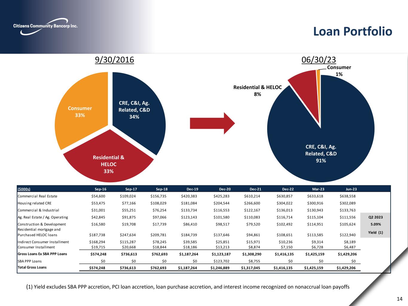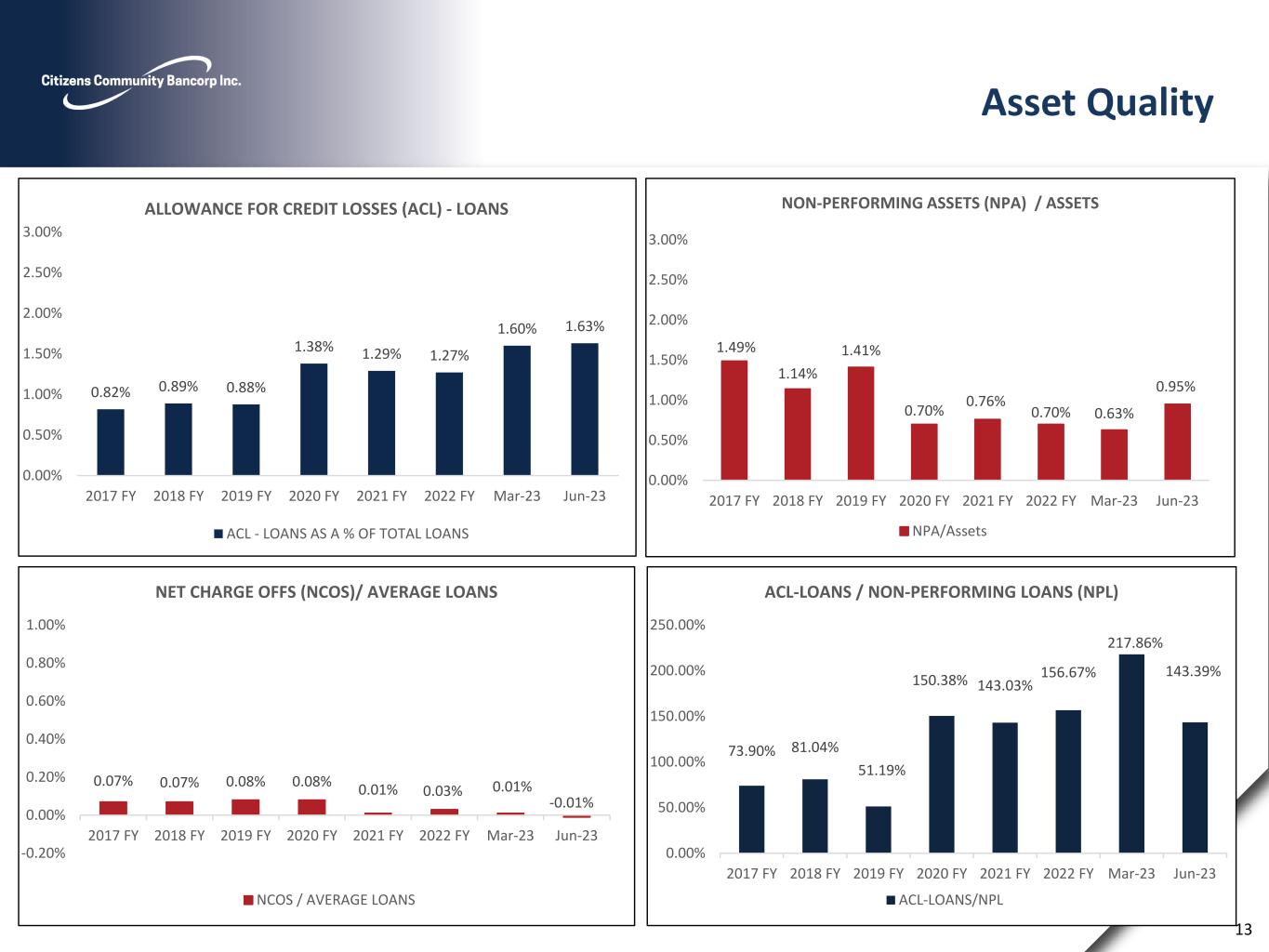 Citizens Community Bancorp, Inc. Capital Ratios Note: 2018 FY represents the completion of the 2018 offering of $65 million, but does not include the acquisition of United Bank Source: S&P Global Market Intelligence, company filings 12 6.6% 12.7% 7.7% 7.7% 7.9% 8.5% 8.5% 8.6% 0.0% 5.0% 10.0% 15.0% 20.0% 2017 FY 2018 FY 2019 FY 2020 FY 2021 FY 2022 FY Mar-23 Jun-23 LEVERAGE RATIO 8.8% 16.8% 9.1% 10.5% 9.7% 9.7% 9.7% 9.9% 0.0% 5.0% 10.0% 15.0% 20.0% 2017 FY 2018 FY 2019 FY 2020 FY 2021 FY 2022 FY Mar-23 Jun-23 COMMON EQUITY TIER 1 RATIO 12.0% 19.8% 11.2% 14.3% 13.1% 14.0% 14.1% 14.3% 0.0% 5.0% 10.0% 15.0% 20.0% 2017 FY 2018 FY 2019 FY 2020 FY 2021 FY 2022 FY Mar-23 Jun-23 TOTAL CAPITAL RATIO Tangible common equity/tangible assets is a non-GAAP measure, which management believes may be helpful in better understanding the underlying business performance trends related to tangible assets and tangible common equity. A reconciliation of tangible common equity and tangible assets to its comparable financial measure can be found in the appendix of the presentation. This measure should not be viewed as a substitute for operating results determined in accordance with GAAP. 6.2% 12.6% 9.9% 7.7% 7.9% 7.5% 7.2% 7.4% 0.0% 5.0% 10.0% 15.0% 20.0% 2017 FY 2018 FY 2019 FY 2020 FY 2021 FY 2022 FY Mar-23 Jun-23 TANGIBLE COMMON EQUITY / TANGIBLE ASSETS