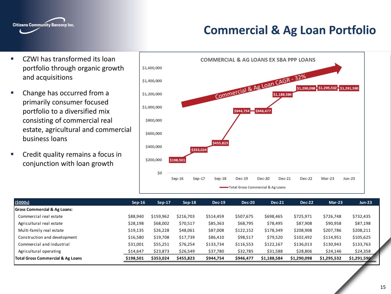 CRE, C&I, Ag. Related, C&D 91% Residential & HELOC 8% Consumer 1% Loan Portfolio 9/30/2016 06/30/23 CRE, C&I, Ag. Related, C&D 34% Residential & HELOC 33% Consumer 33% 14 (1) Yield excludes SBA PPP accretion, PCI loan accretion, loan purchase accretion, and interest income recognized on nonaccrual loan payoffs ($000s) Sep-16 Sep-17 Sep-18 Dec-19 Dec-20 Dec-21 Dec-22 Mar-23 Jun-23 Commercial Real Estate $54,600 $109,024 $156,735 $420,383 $425,283 $610,214 $630,857 $633,618 $638,558 Housing related CRE $53,475 $77,166 $108,029 $181,084 $204,544 $266,600 $304,022 $300,916 $302,089 Commercial & Industrial $31,001 $55,251 $76,254 $133,734 $116,553 $122,167 $136,013 $130,943 $133,763 Ag. Real Estate / Ag. Operating $42,845 $91,875 $97,066 $123,143 $101,580 $110,083 $116,714 $115,104 $111,556 Q2 2023 Construction & Development $16,580 $19,708 $17,739 $86,410 $98,517 $79,520 $102,492 $114,951 $105,624 5.09% Residential mortgage and Purchased HELOC loans $187,738 $247,634 $209,781 $184,739 $137,646 $94,861 $108,651 $113,585 $122,940 Yield (1) Indirect Consumer Installment $168,294 $115,287 $78,245 $39,585 $25,851 $15,971 $10,236 $9,314 $8,189 Consumer Installment $19,715 $20,668 $18,844 $18,186 $13,213 $8,874 $7,150 $6,728 $6,487 Gross Loans Ex SBA PPP Loans $574,248 $736,613 $762,693 $1,187,264 $1,123,187 $1,308,290 $1,416,135 $1,425,159 $1,429,206 SBA PPP Loans $0 $0 $0 $0 $123,702 $8,755 $0 $0 $0 Total Gross Loans $574,248 $736,613 $762,693 $1,187,264 $1,246,889 $1,317,045 $1,416,135 $1,425,159 $1,429,206