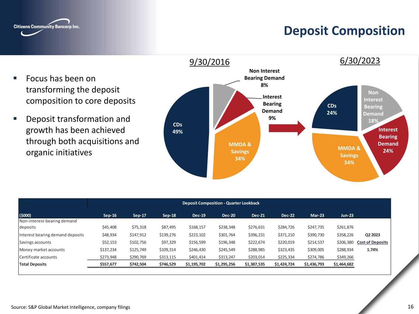 Commercial & Ag Loan Portfolio CZWI has transformed its loan portfolio through organic growth and acquisitions Change has occurred from a primarily consumer focused portfolio to a diversified mix consisting of commercial real estate, agricultural and commercial business loans Credit quality remains a focus in conjunction with loan growth 15 ($000s) Sep-16 Sep-17 Sep-18 Dec-19 Dec-20 Dec-21 Dec-22 Mar-23 Jun-23 Gross Commercial & Ag Loans: Commercial real estate $88,940 $159,962 $216,703 $514,459 $507,675 $698,465 $725,971 $726,748 $732,435 Agricultural real estate $28,198 $68,002 $70,517 $85,363 $68,795 $78,495 $87,908 $90,958 $87,198 Multi-family real estate $19,135 $26,228 $48,061 $87,008 $122,152 $178,349 $208,908 $207,786 $208,211 Construction and development $16,580 $19,708 $17,739 $86,410 $98,517 $79,520 $102,492 $114,951 $105,625 Commercial and industrial $31,001 $55,251 $76,254 $133,734 $116,553 $122,167 $136,013 $130,943 $133,763 Agricultural operating $14,647 $23,873 $26,549 $37,780 $32,785 $31,588 $28,806 $24,146 $24,358 Total Gross Commercial & Ag Loans $198,501 $353,024 $455,823 $944,754 $946,477 $1,188,584 $1,290,098 $1,295,532 $1,291,590