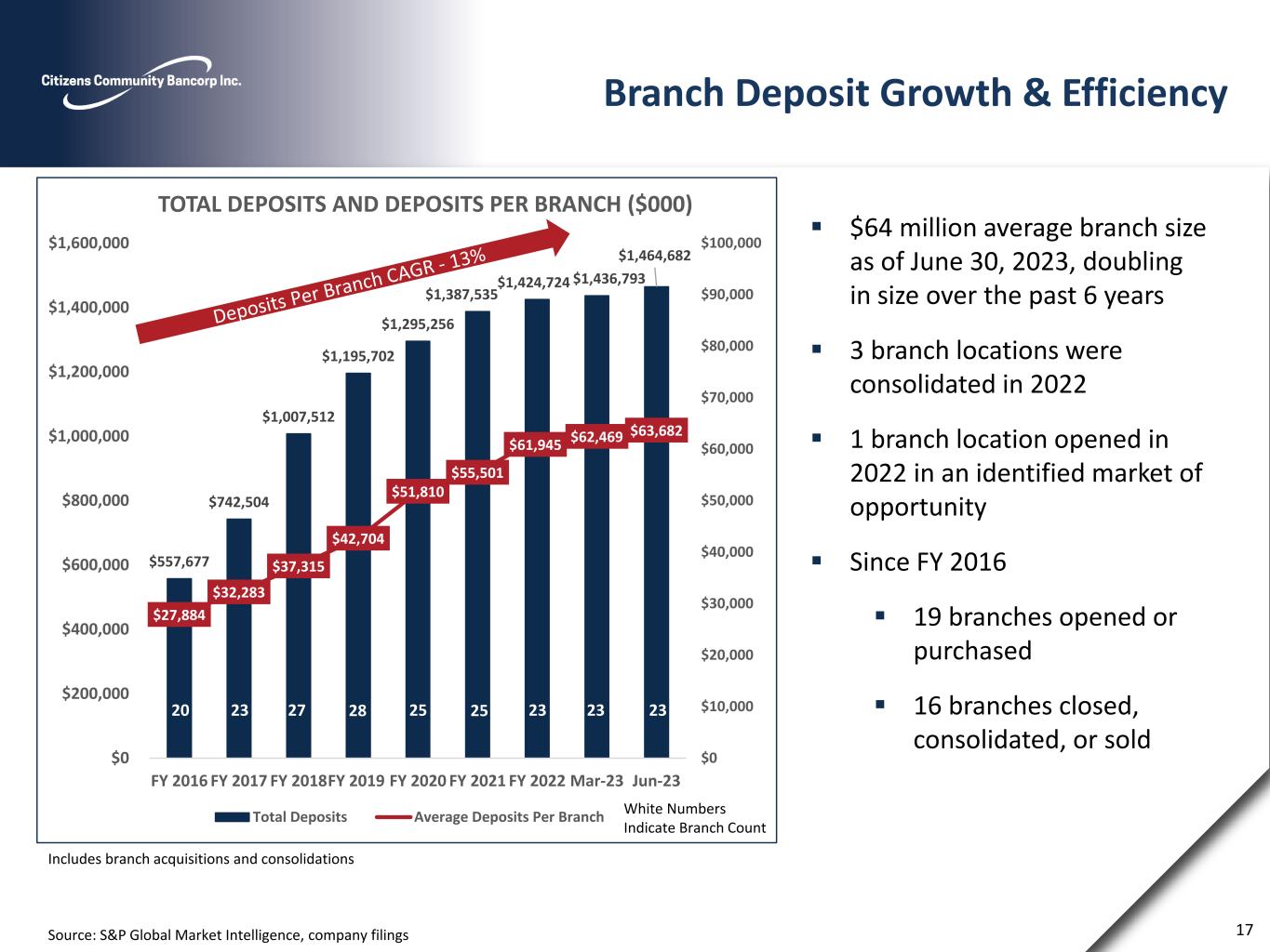 Deposit Composition Focus has been on transforming the deposit composition to core deposits Deposit transformation and growth has been achieved through both acquisitions and organic initiatives 9/30/2016 6/30/2023 Source: S&P Global Market Intelligence, company filings Non Interest Bearing Demand 8% Interest Bearing Demand 9% MMDA & Savings 34% CDs 49% 16 Non Interest Bearing Demand 18% Interest Bearing Demand 24%MMDA & Savings 34% CDs 24% ($000) Sep-16 Sep-17 Sep-18 Dec-19 Dec-20 Dec-21 Dec-22 Mar-23 Jun-23 Non-interest-bearing demand deposits $45,408 $75,318 $87,495 $168,157 $238,348 $276,631 $284,726 $247,735 $261,876 Interest bearing demand deposits $48,934 $147,912 $139,276 $223,102 $301,764 $396,231 $371,210 $390,730 $358,226 Q2 2023 Savings accounts $52,153 $102,756 $97,329 $156,599 $196,348 $222,674 $220,019 $214,537 $206,380 Cost of Deposits Money market accounts $137,234 $125,749 $109,314 $246,430 $245,549 $288,985 $323,435 $309,005 $288,934 1.74% Certificate accounts $273,948 $290,769 $313,115 $401,414 $313,247 $203,014 $225,334 $274,786 $349,266 Total Deposits $557,677 $742,504 $746,529 $1,195,702 $1,295,256 $1,387,535 $1,424,724 $1,436,793 $1,464,682 Deposit Composition - Quarter Lookback