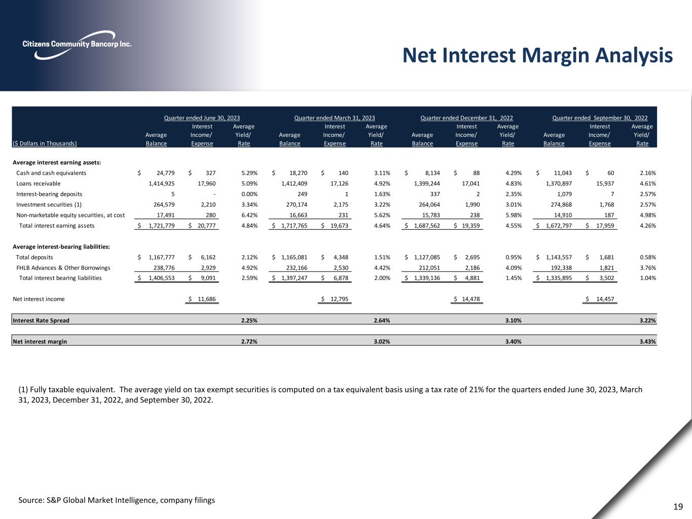 Net Interest Margin Analysis Source: S&P Global Market Intelligence, company filings 19 (1) Fully taxable equivalent. The average yield on tax exempt securities is computed on a tax equivalent basis using a tax rate of 21% for the quarters ended June 30, 2023, March 31, 2023, December 31, 2022, and September 30, 2022. Quarter ended June 30, 2023 Quarter ended March 31, 2023 Quarter ended December 31, 2022 Quarter ended September 30, 2022 Interest Average Interest Average Interest Average Interest Average Average Income/ Yield/ Average Income/ Yield/ Average Income/ Yield/ Average Income/ Yield/ ($ Dollars in Thousands) Balance Expense Rate Balance Expense Rate Balance Expense Rate Balance Expense Rate Average interest earning assets: Cash and cash equivalents 24,779$ 327$ 5.29% 18,270$ 140$ 3.11% 8,134$ 88$ 4.29% 11,043$ 60$ 2.16% Loans receivable 1,414,925 17,960 5.09% 1,412,409 17,126 4.92% 1,399,244 17,041 4.83% 1,370,897 15,937 4.61% Interest-bearing deposits 5 - 0.00% 249 1 1.63% 337 2 2.35% 1,079 7 2.57% Investment securities (1) 264,579 2,210 3.34% 270,174 2,175 3.22% 264,064 1,990 3.01% 274,868 1,768 2.57% Non-marketable equity securities, at cost 17,491 280 6.42% 16,663 231 5.62% 15,783 238 5.98% 14,910 187 4.98% Total interest earning assets 1,721,779$ 20,777$ 4.84% 1,717,765$ 19,673$ 4.64% 1,687,562$ 19,359$ 4.55% 1,672,797$ 17,959$ 4.26% Average interest-bearing liabilities: Total deposits 1,167,777$ 6,162$ 2.12% 1,165,081$ 4,348$ 1.51% 1,127,085$ 2,695$ 0.95% 1,143,557$ 1,681$ 0.58% FHLB Advances & Other Borrowings 238,776 2,929 4.92% 232,166 2,530 4.42% 212,051 2,186 4.09% 192,338 1,821 3.76% Total interest bearing liabilities 1,406,553$ 9,091$ 2.59% 1,397,247$ 6,878$ 2.00% 1,339,136$ 4,881$ 1.45% 1,335,895$ 3,502$ 1.04% Net interest income 11,686$ 12,795$ 14,478$ 14,457$ Interest Rate Spread 2.25% 2.64% 3.10% 3.22% Net interest margin 2.72% 3.02% 3.40% 3.43%