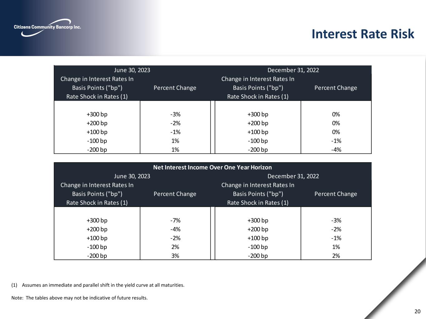 Interest Rate Risk 20 (1) Assumes an immediate and parallel shift in the yield curve at all maturities. Note: The tables above may not be indicative of future results. Change in Interest Rates In Basis Points ("bp") Rate Shock in Rates (1) Percent Change Change in Interest Rates In Basis Points ("bp") Rate Shock in Rates (1) Percent Change +300 bp -3% +300 bp 0% +200 bp -2% +200 bp 0% +100 bp -1% +100 bp 0% -100 bp 1% -100 bp -1% -200 bp 1% -200 bp -4% Change in Interest Rates In Basis Points ("bp") Rate Shock in Rates (1) Percent Change Change in Interest Rates In Basis Points ("bp") Rate Shock in Rates (1) Percent Change +300 bp -7% +300 bp -3% +200 bp -4% +200 bp -2% +100 bp -2% +100 bp -1% -100 bp 2% -100 bp 1% -200 bp 3% -200 bp 2% December 31, 2022June 30, 2023 December 31, 2022June 30, 2023 Net Interest Income Over One Year Horizon
