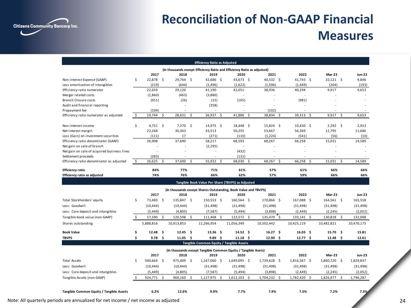 Note: All quarterly periods are annualized for net income / net income as adjusted. 23 Reconciliation of Non-GAAP Financial Measures 2017 2018 2019 2020 2021 2022 Mar-23 Jun-23 Net Income 2,499$ 4,283$ 9,463$ 12,725$ 21,266$ 17,761$ 3,662$ 3,206$ Net Income as adjusted 4,221$ 4,962$ 10,675$ 12,425$ 21,339$ 18,500$ 3,662$ 3,206$ Average assets 731,407$ 954,912$ 1,398,482$ 1,594,053$ 1,722,483$ 1,775,049$ 1,823,748$ 1,844,196$ Return on average assets 0.34% 0.45% 0.68% 0.80% 1.23% 1.00% 0.81% 0.70% Return on average assets as adjusted 0.58% 0.52% 0.76% 0.78% 1.24% 1.04% 0.81% 0.70% 2017 2018 2019 2020 2021 2022 Mar-23 Jun-23 Common Equity 73,483$ 135,847$ 150,553$ 160,564$ 170,866$ 167,088$ 164,561$ 165,558$ Less: Goodwill (10,444) (10,444) (31,498) (31,498) (31,498) (31,498) (31,498) (31,498) Less: Core Deposit and other intangibles (5,449) (4,805) (7,587) (5,494) (3,898) (2,449) (2,245) (2,052) Tangible Common Equity (TCE) 57,590$ 120,598$ 111,468$ 123,572$ 135,470$ 133,141$ 130,818$ 132,008$ Average Tangible Common Equity 58,300$ 89,094$ 105,340$ 115,313$ 127,793$ 131,305$ 130,582$ 131,016$ Net Income 2,499$ 4,283$ 9,463$ 12,725$ 21,266$ 17,761$ 3,662$ 3,206$ Intangible amortization, net of tax 143 417 1,153 1,194 1,171 1,095 152 144 Tangible Net Income 2,642$ 4,700$ 10,616$ 13,919$ 22,437$ 18,856$ 3,814$ 3,350$ Net Income as adjusted 4,221$ 4,962$ 10,675$ 12,425$ 21,339$ 18,500$ 3,662$ 3,206$ Intangible amortization, net of tax 143 417 1,153 1,194 1,171 1,095 152 144 Tangible Net Income as adjusted 4,364$ 5,379$ 11,828$ 13,619$ 22,510$ 19,595$ 3,814$ 3,350$ ROATCE 4.5% 5.3% 10.1% 12.1% 17.6% 14.4% 11.8% 10.3% ROATCE as adjusted 7.5% 6.0% 11.2% 11.8% 17.6% 14.9% 11.8% 10.3% Return on Average Assets (ROAA) as Adjusted Return on Average Tangible Common Equity (ROATCE) as Adjusted (In thousands except ROATCE and ROATCE as adjusted) (In thousands except ROAA and ROAA as adjusted)