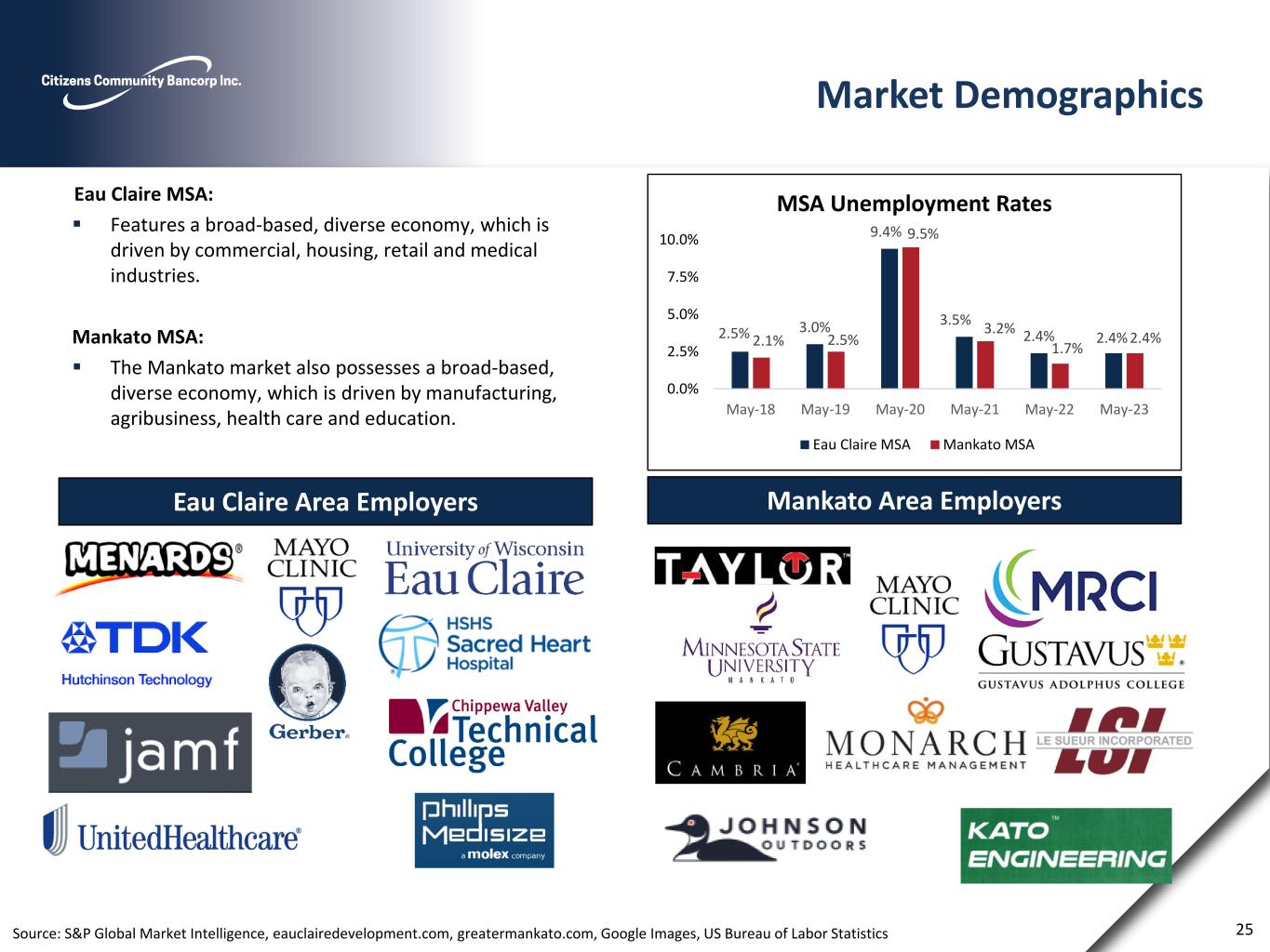 Reconciliation of Non-GAAP Financial Measures Note: All quarterly periods are annualized for net income / net income as adjusted 24 2017 2018 2019 2020 2021 2022 Mar-23 Jun-23 Non-interest Expense (GAAP) 22,878$ 29,764$ 42,686$ 43,673$ 40,532$ 41,743$ 10,121$ 9,846$ Less amortization of intangibles (219) (644) (1,496) (1,622) (1,596) (1,449) (204) (193) Efficiency ratio numerator 22,659 29,120 41,190 42,051 38,936 40,294 9,917 9,653 Merger related costs (1,860) (463) (3,880) - - - - - Branch Closure costs (951) (26) (15) (165) - (981) - - Audit and financial reporting - - (358) - - - - - Prepayment fee (104) - - - (102) - - - Efficiency ratio numerator as adjusted 19,744$ 28,631$ 36,937$ 41,886$ 38,834$ 39,313$ 9,917$ 9,653$ Non-interest income 4,751$ 7,370$ 14,975$ 18,448$ 15,824$ 10,430$ 2,292$ 2,913$ Net interest margin 22,268 30,303 43,513 50,255 53,667 56,369 12,795 11,686 Loss (Gain) on investment securities (111) 17 (271) (110) (1,224) (541) (56) (10) Efficiency ratio denominator (GAAP) 26,908 37,690 58,217 68,593 68,267 66,258 15,031 14,589 Net gain on sale of branch - - (2,295) - - - - - Net gain on sale of acquired business l ines - - - (432) - - - - Settlement proceeds (283) - - (131) - - - - Efficiency ratio denominator as adjusted 26,625$ 37,690$ 55,922$ 68,030$ 68,267$ 66,258$ 15,031$ 14,589$ Efficiency ratio 84% 77% 71% 61% 57% 61% 66% 66% Efficiency ratio as adjusted 74% 76% 66% 62% 57% 59% 66% 66% 2017 2018 2019 2020 2021 2022 Mar-23 Jun-23 Total Stockholders' equity 73,483$ 135,847$ 150,553$ 160,564$ 170,866$ 167,088$ 164,561$ 165,558$ Less: Goodwill (10,444) (10,444) (31,498) (31,498) (31,498) (31,498) (31,498) (31,498) Less: Core deposit and intangibles (5,449) (4,805) (7,587) (5,494) (3,898) (2,449) (2,245) (2,052) Tangible book value (non-GAAP) 57,590$ 120,598$ 111,468$ 123,572$ 135,470$ 133,141$ 130,818$ 132,008$ Shares outstanding 5,888,816 10,913,853 11,266,954 11,056,349 10,502,442 10,425,119 10,482,821 10,470,175 Book Value 12.48$ 12.45$ 13.36$ 14.52$ 16.27$ 16.03$ 15.70$ 15.81$ TBVPS 9.78$ 11.05$ 9.89$ 11.18$ 12.90$ 12.77$ 12.48$ 12.61$ 2017 2018 2019 2020 2021 2022 Mar-23 Jun-23 Total Assets 940,664$ 975,409$ 1,167,060$ 1,649,095$ 1,739,628$ 1,816,367$ 1,860,720$ 1,829,837$ Less: Goodwill (10,444) (10,444) (31,498) (31,498) (31,498) (31,498) (31,498) (31,498) Less: Core deposit and intangibles (5,449) (4,805) (7,587) (5,494) (3,898) (2,449) (2,245) (2,052) Tangible Assets (non-GAAP) 924,771$ 960,160$ 1,127,975$ 1,612,103$ 1,704,232$ 1,782,420$ 1,826,977$ 1,796,287$ Tangible Common Equity / Tangible Assets 6.2% 12.6% 9.9% 7.7% 7.9% 7.5% 7.2% 7.3% Efficiency Ratio as Adjusted Tangible Book Value Per Share (TBVPS) as Adjusted Tangible Common Equity / Tangible Assets (In thousands except Tangible Common Equity / Tangible Asets) (In thousands except Shares Outstanding, Book Value and TBVPS) (In thousands except Efficiency Ratio and Efficiency Ratio as adjusted)