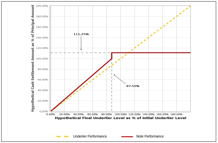| · | if the underlier return is greater than or equal to -12.50% (i.e. the final underlier level is greater than or equal to 87.50% of the initial underlier level), the maximum settlement amount; or |