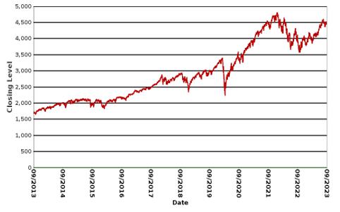 The graph below shows the daily historical closing levels of the underlier from September 11, 2013 through September 11, 2023. On September 11, 2023, the closing level of the underlier was 4,487.46. We obtained the closing levels in the graph below from Bloomberg Financial Services, without independent verification.