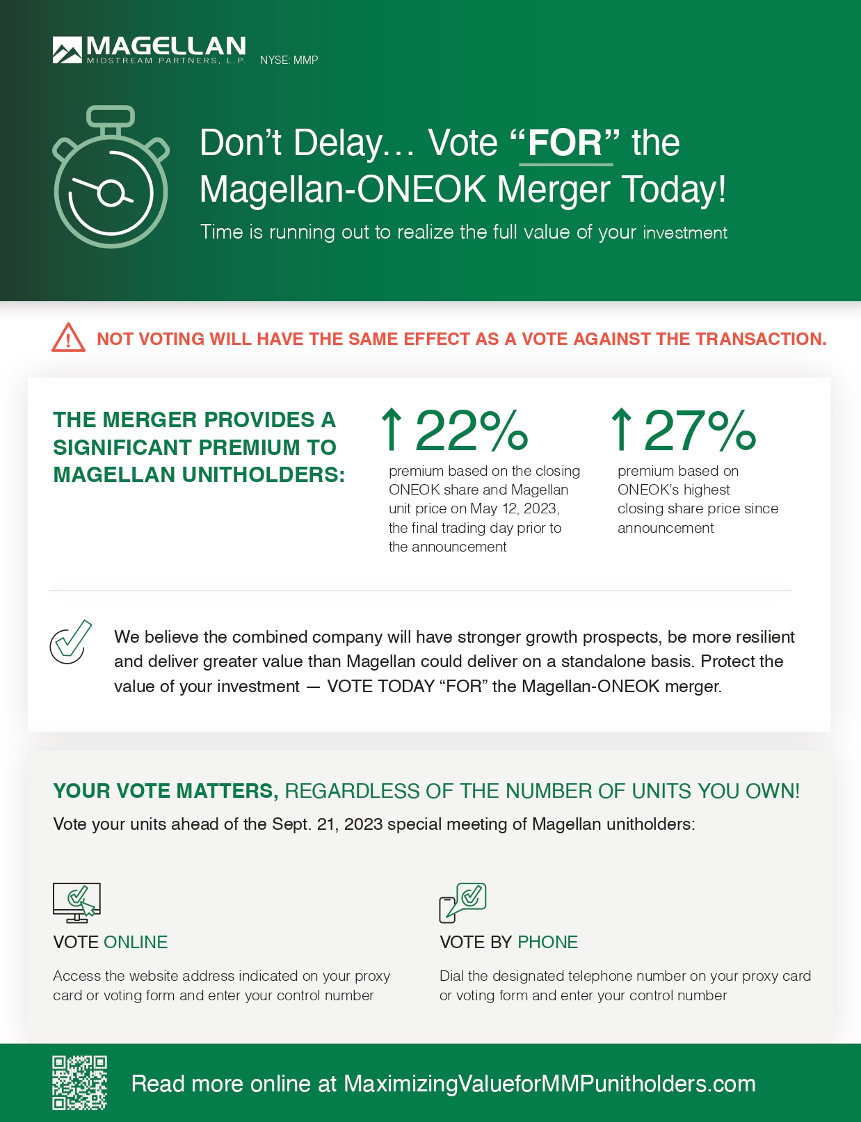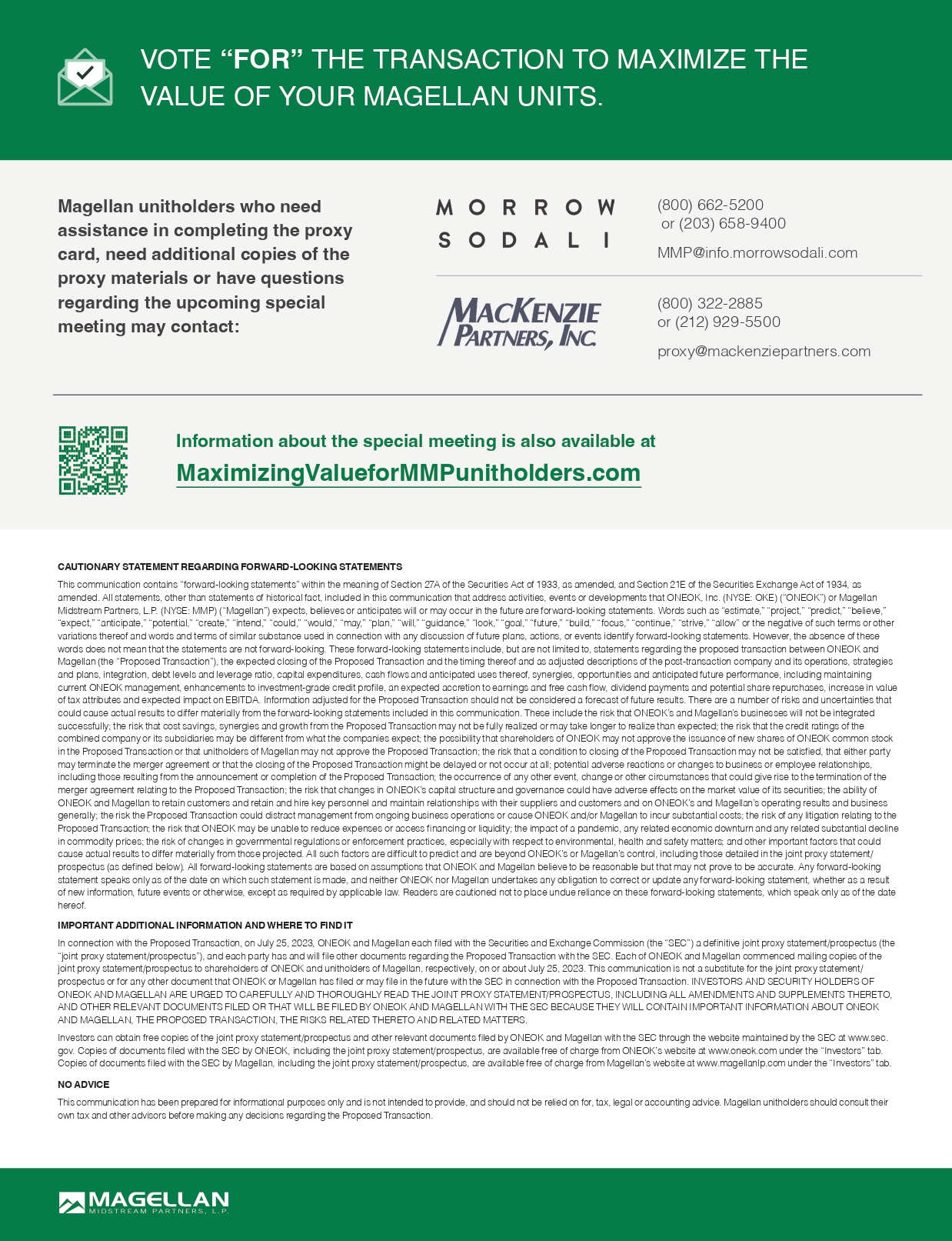 In connection with the Proposed Transaction, on July 25, 2023, ONEOK and Magellan each filed with the Securities and Exchange Commission (the “SEC”) a definitive joint proxy statement/prospectus (the “joint proxy statement/prospectus”), and each party has and will file other documents regarding the Proposed Transaction with the SEC. Each of ONEOK and Magellan commenced mailing copies of the joint proxy statement/prospectus to shareholders of ONEOK and unitholders of Magellan, respectively, on or about July 25, 2023. This communication is not a substitute for the joint proxy statement/prospectus or for any other document that ONEOK or Magellan has filed or may file in the future with the SEC in connection with the Proposed Transaction. INVESTORS AND SECURITY HOLDERS OF ONEOK AND MAGELLAN ARE URGED TO CAREFULLY AND THOROUGHLY READ THE JOINT PROXY STATEMENT/PROSPECTUS, INCLUDING ALL AMENDMENTS AND SUPPLEMENTS THERETO, AND OTHER RELEVANT DOCUMENTS FILED OR THAT WILL BE FILED BY ONEOK AND MAGELLAN WITH THE SEC BECAUSE THEY WILL CONTAIN IMPORTANT INFORMATION ABOUT ONEOK AND MAGELLAN, THE PROPOSED TRANSACTION, THE RISKS RELATED THERETO AND RELATED MATTERS.