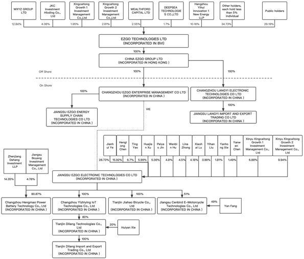 The diagram below shows our corporate structure as of the date of this prospectus supplement, including the VIE and its subsidiaries. However, investors are cautioned that the enforceability of such VIE Agreements has not been tested in a court of law. EZGO conducts operations in China primarily through the VIE and its subsidiaries in China, and EZGO does not conduct any business on its own. The VIE structure is used to provide investors with contractual exposure to foreign investment in China-based companies where Chinese law prohibits or restricts direct foreign investment in the operating companies. Due to PRC legal restrictions on foreign ownership in internet-based businesses, we do not have any equity ownership of the VIE, instead we receive the economic benefits of the VIE’s business operations through certain contractual arrangements. As a result of such series of contractual arrangements, EZGO and its subsidiaries become the primary beneficiary of the VIE for accounting purposes and the VIE as a PRC consolidated entity under U.S. GAAP. We consolidate the financial results of the VIE and its subsidiaries in our consolidated financial statements in accordance with U.S. GAAP. Neither we nor EZGO’s investors own any equity ownership in, direct foreign investment in, or control through such ownership/investment of the VIE. Investors are purchasing an interest in EZGO, the BVI holding company.