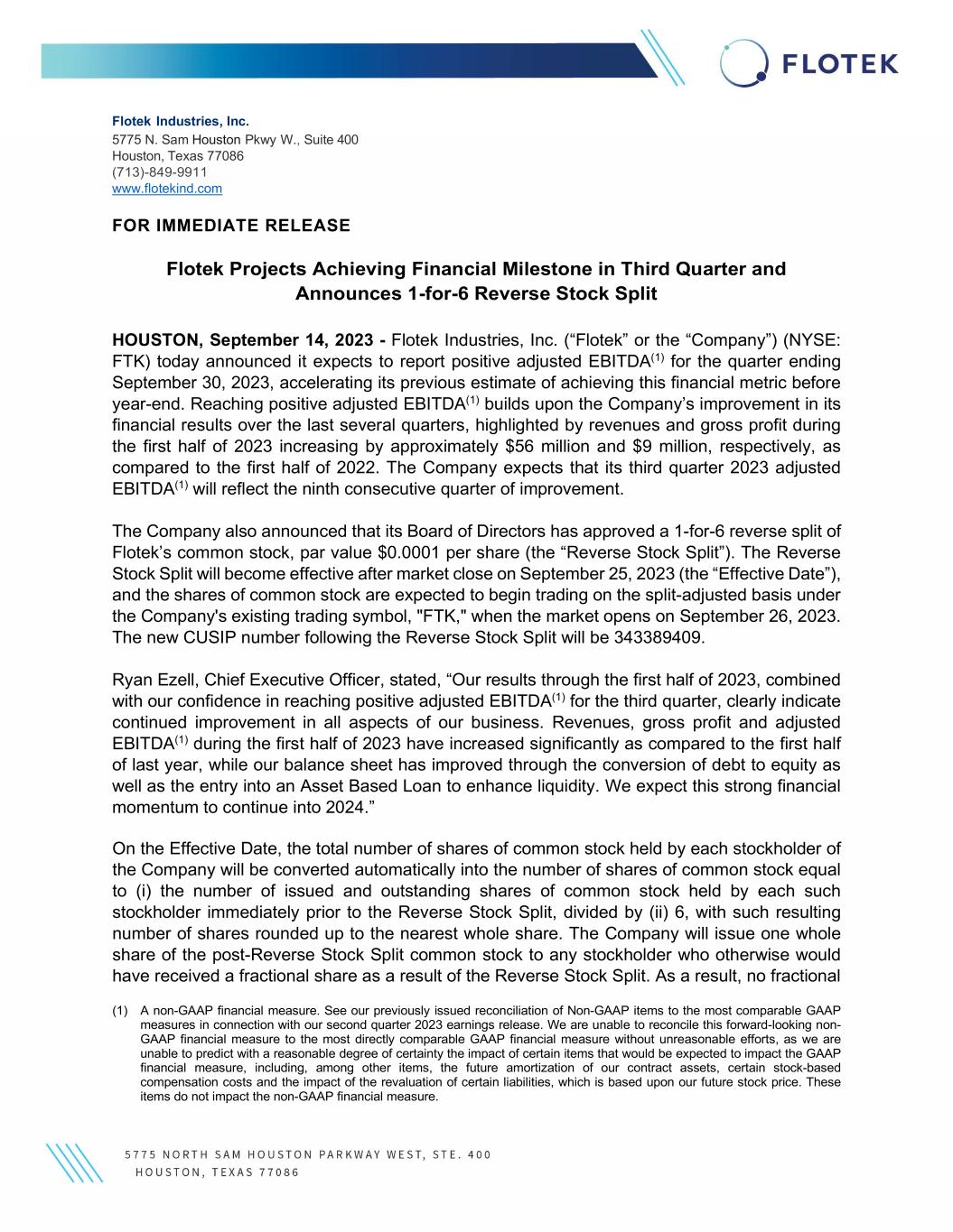 Flotek Industries, Inc. 5775 N. Sam Houston Pkwy W., Suite 400 Houston, Texas 77086 (713)-849-9911 www.flotekind.com FOR IMMEDIATE RELEASE Flotek Projects Achieving Financial Milestone in Third Quarter and Announces 1-for-6 Reverse Stock Split HOUSTON, September 14, 2023 - Flotek Industries, Inc. (“Flotek” or the “Company”) (NYSE: FTK) today announced it expects to report positive adjusted EBITDA(1) for the quarter ending September 30, 2023, accelerating its previous estimate of achieving this financial metric before year-end. Reaching positive adjusted EBITDA(1) builds upon the Company’s improvement in its financial results over the last several quarters, highlighted by revenues and gross profit during the first half of 2023 increasing by approximately $56 million and $9 million, respectively, as compared to the first half of 2022. The Company expects that its third quarter 2023 adjusted EBITDA(1) will reflect the ninth consecutive quarter of improvement. The Company also announced that its Board of Directors has approved a 1-for-6 reverse split of Flotek’s common stock, par value $0.0001 per share (the “Reverse Stock Split”). The Reverse Stock Split will become effective after market close on September 25, 2023 (the “Effective Date”), and the shares of common stock are expected to begin trading on the split-adjusted basis under the Company's existing trading symbol, "FTK," when the market opens on September 26, 2023. The new CUSIP number following the Reverse Stock Split will be 343389409. Ryan Ezell, Chief Executive Officer, stated, “Our results through the first half of 2023, combined with our confidence in reaching positive adjusted EBITDA(1) for the third quarter, clearly indicate continued improvement in all aspects of our business. Revenues, gross profit and adjusted EBITDA(1) during the first half of 2023 have increased significantly as compared to the first half of last year, while our balance sheet has improved through the conversion of debt to equity as well as the entry into an Asset Based Loan to enhance liquidity. We expect this strong financial momentum to continue into 2024.” On the Effective Date, the total number of shares of common stock held by each stockholder of the Company will be converted automatically into the number of shares of common stock equal to (i) the number of issued and outstanding shares of common stock held by each such stockholder immediately prior to the Reverse Stock Split, divided by (ii) 6, with such resulting number of shares rounded up to the nearest whole share. The Company will issue one whole share of the post-Reverse Stock Split common stock to any stockholder who otherwise would have received a fractional share as a result of the Reverse Stock Split. As a result, no fractional (1) A non-GAAP financial measure. See our previously issued reconciliation of Non-GAAP items to the most comparable GAAP measures in connection with our second quarter 2023 earnings release. We are unable to reconcile this forward-looking non- GAAP financial measure to the most directly comparable GAAP financial measure without unreasonable efforts, as we are unable to predict with a reasonable degree of certainty the impact of certain items that would be expected to impact the GAAP financial measure, including, among other items, the future amortization of our contract assets, certain stock-based compensation costs and the impact of the revaluation of certain liabilities, which is based upon our future stock price. These items do not impact the non-GAAP financial measure.