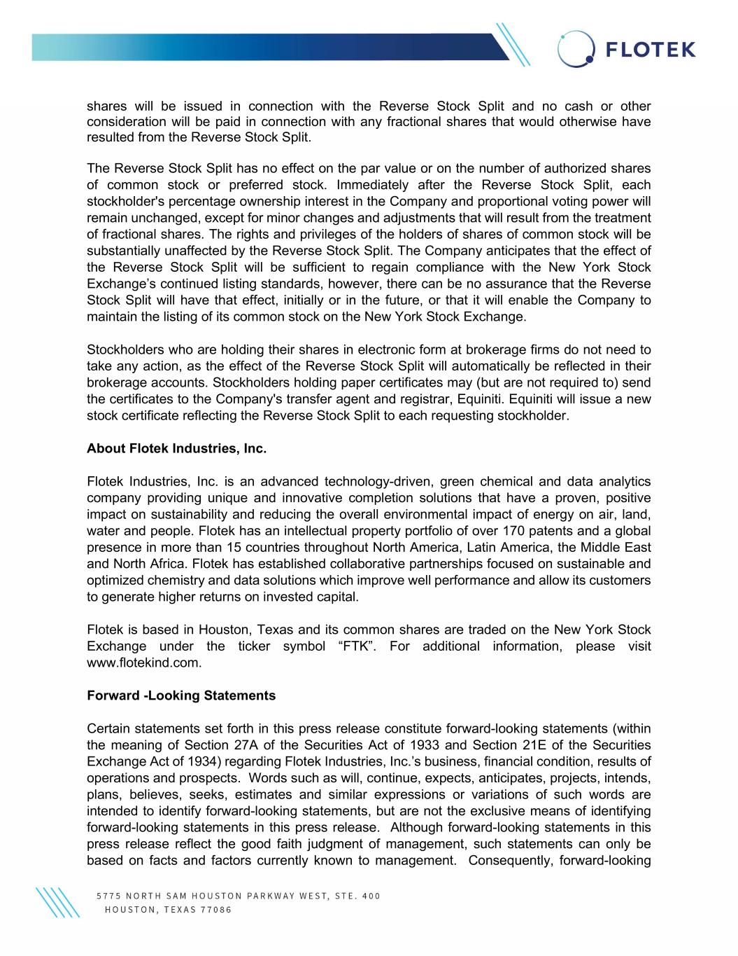 shares will be issued in connection with the Reverse Stock Split and no cash or other consideration will be paid in connection with any fractional shares that would otherwise have resulted from the Reverse Stock Split. The Reverse Stock Split has no effect on the par value or on the number of authorized shares of common stock or preferred stock. Immediately after the Reverse Stock Split, each stockholder's percentage ownership interest in the Company and proportional voting power will remain unchanged, except for minor changes and adjustments that will result from the treatment of fractional shares. The rights and privileges of the holders of shares of common stock will be substantially unaffected by the Reverse Stock Split. The Company anticipates that the effect of the Reverse Stock Split will be sufficient to regain compliance with the New York Stock Exchange’s continued listing standards, however, there can be no assurance that the Reverse Stock Split will have that effect, initially or in the future, or that it will enable the Company to maintain the listing of its common stock on the New York Stock Exchange. Stockholders who are holding their shares in electronic form at brokerage firms do not need to take any action, as the effect of the Reverse Stock Split will automatically be reflected in their brokerage accounts. Stockholders holding paper certificates may (but are not required to) send the certificates to the Company's transfer agent and registrar, Equiniti. Equiniti will issue a new stock certificate reflecting the Reverse Stock Split to each requesting stockholder. About Flotek Industries, Inc. Flotek Industries, Inc. is an advanced technology-driven, green chemical and data analytics company providing unique and innovative completion solutions that have a proven, positive impact on sustainability and reducing the overall environmental impact of energy on air, land, water and people. Flotek has an intellectual property portfolio of over 170 patents and a global presence in more than 15 countries throughout North America, Latin America, the Middle East and North Africa. Flotek has established collaborative partnerships focused on sustainable and optimized chemistry and data solutions which improve well performance and allow its customers to generate higher returns on invested capital. Flotek is based in Houston, Texas and its common shares are traded on the New York Stock Exchange under the ticker symbol “FTK”. For additional information, please visit www.flotekind.com. Forward -Looking Statements Certain statements set forth in this press release constitute forward-looking statements (within the meaning of Section 27A of the Securities Act of 1933 and Section 21E of the Securities Exchange Act of 1934) regarding Flotek Industries, Inc.’s business, financial condition, results of operations and prospects. Words such as will, continue, expects, anticipates, projects, intends, plans, believes, seeks, estimates and similar expressions or variations of such words are intended to identify forward-looking statements, but are not the exclusive means of identifying forward-looking statements in this press release. Although forward-looking statements in this press release reflect the good faith judgment of management, such statements can only be based on facts and factors currently known to management. Consequently, forward-looking