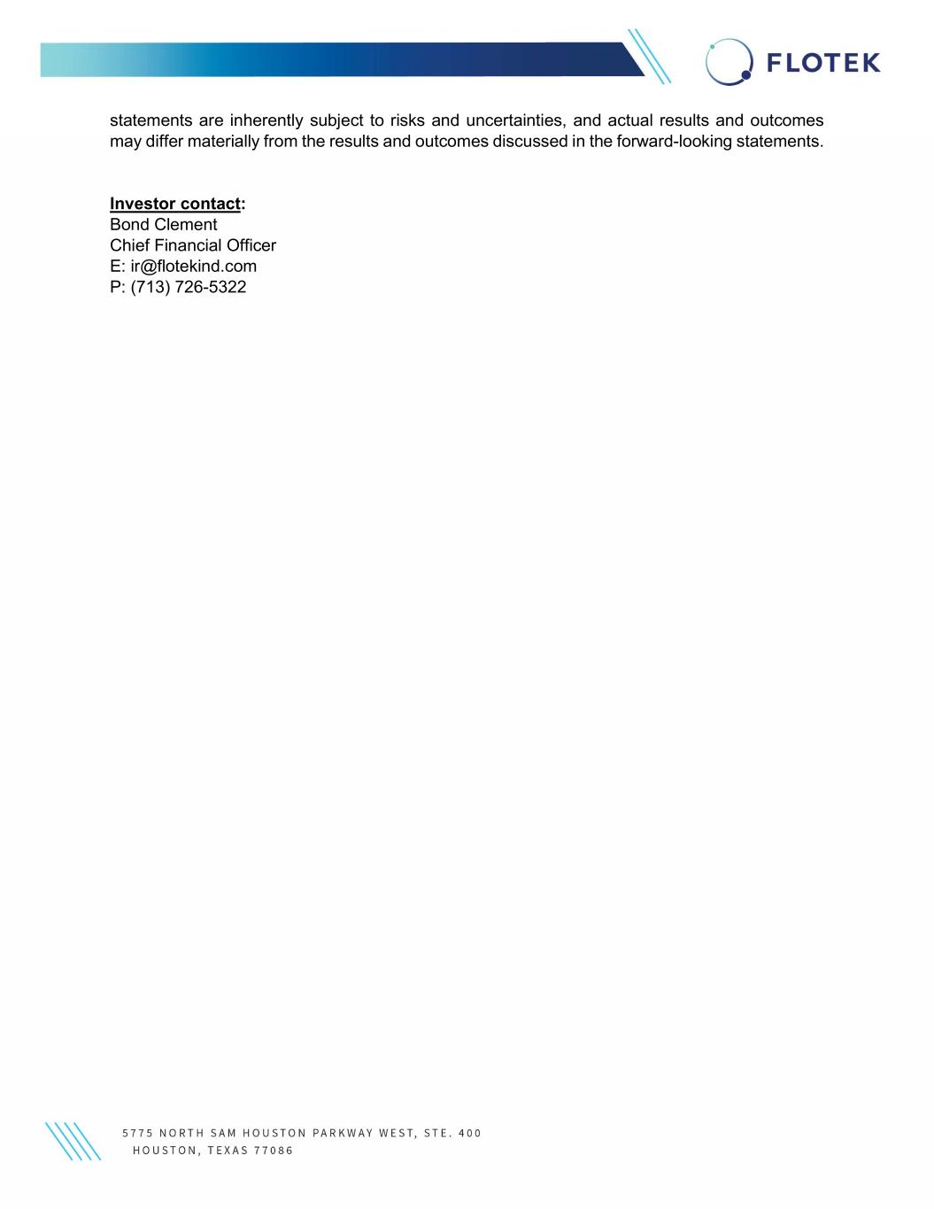 statements are inherently subject to risks and uncertainties, and actual results and outcomes may differ materially from the results and outcomes discussed in the forward-looking statements. Investor contact: Bond Clement Chief Financial Officer E: ir@flotekind.com P: (713) 726-5322