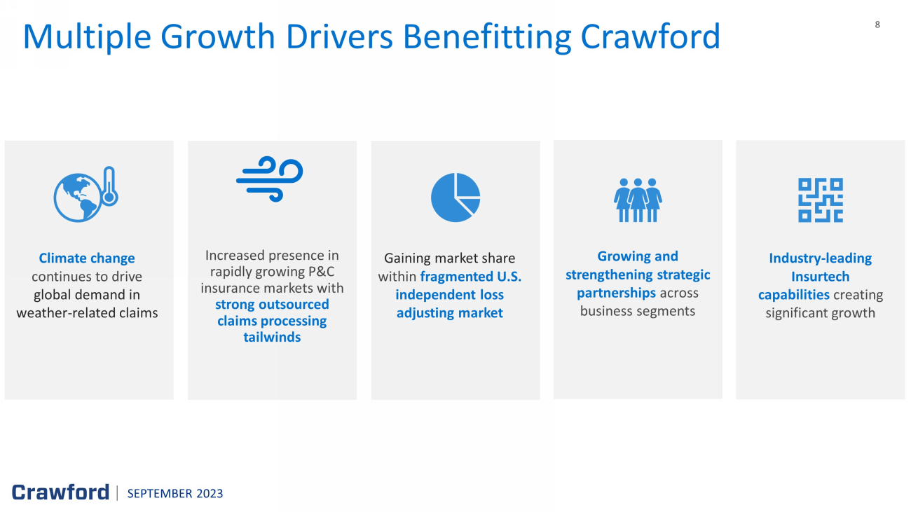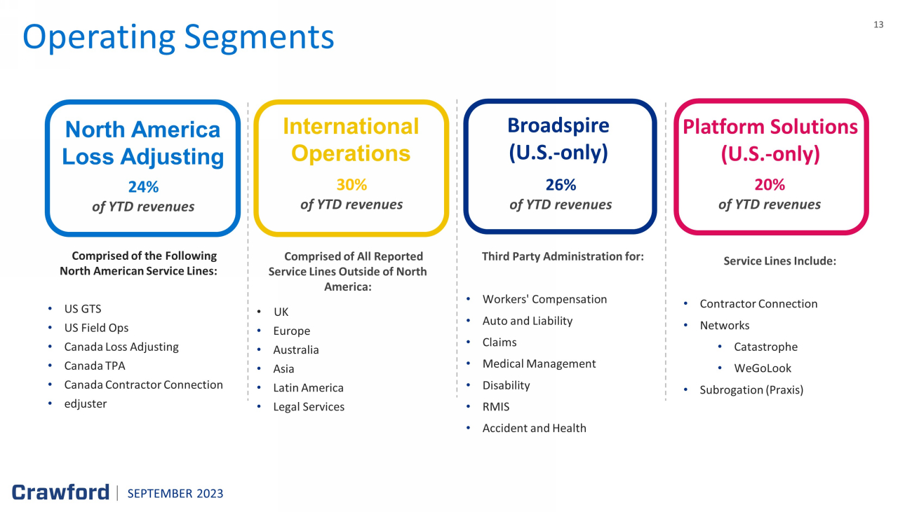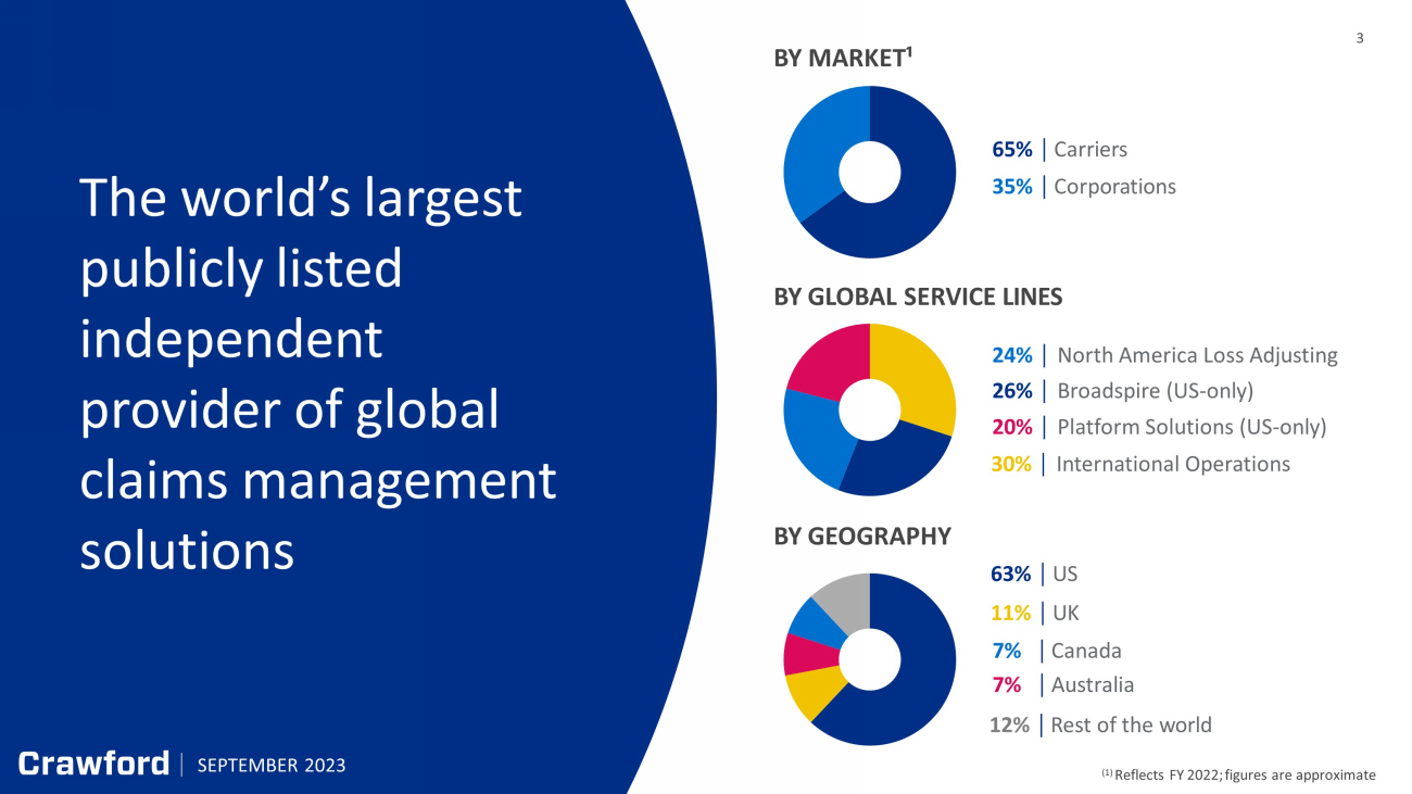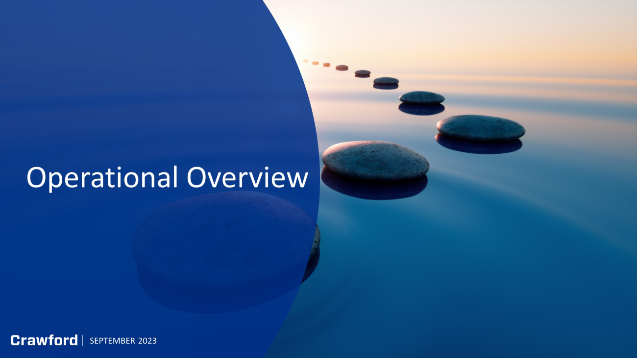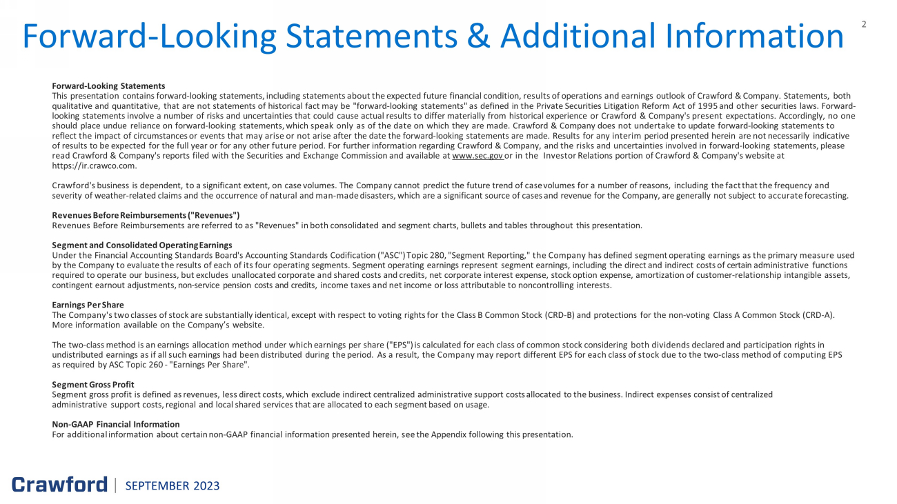 2 Forward - Looking Statements & Additional Information SEPTEMBER 2023 Forward - Looking Statements This presentation contains forward - looking statements, including statements about the expected future financial condition, results of operations and earnings outlook of Crawford & Company. Statements, both qualitative and quantitative, that are not statements of historical fact may be "forward - looking statements" as defined in the Private Securities Litigation Reform Act of 1995 and other securities laws. Forward - looking statements involve a number of risks and uncertainties that could cause actual results to differ materially from historical experience or Crawford & Company's present expectations. Accordingly, no one should place undue reliance on forward - looking statements, which speak only as of the date on which they are made. Crawford & Company does not undertake to update forward - looking statements to reflect the impact of circumstances or events that may arise or not arise after the date the forward - looking statements are made. Results for any interim period presented herein are not necessarily indicative of results to be expected for the full year or for any other future period. For further information regarding Crawford & Company, and the risks and uncertainties involved in forward - looking statements, please read Crawford & Company's reports filed with the Securities and Exchange Commission and available at www.sec.gov or in the Investor Relations portion of Crawford & Company's website at https:// ir.crawco.com . Crawford's business is dependent, to a significant extent, on case volumes. The Company cannot predict the future trend of ca se volumes for a number of reasons, including the fact that the frequency and severity of weather - related claims and the occurrence of natural and man - made disasters, which are a significant source of cases and revenue for the Company, are generally not subject to accurate forecasting. Revenues Before Reimbursements ("Revenues") Revenues Before Reimbursements are referred to as "Revenues" in both consolidated and segment charts, bullets and tables throughout this presentation. Segment and Consolidated Operating Earnings Under the Financial Accounting Standards Board's Accounting Standards Codification ("ASC") Topic 280, "Segment Reporting," the Company has defined segment operating earnings as the primary measure used by the Company to evaluate the results of each of its four operating segments. Segment operating earnings represent segment earnings, including the direct and indirect costs of certain administrative functions required to operate our business, but excludes unallocated corporate and shared costs and credits, n et corporate interest expense, stock option expense, amortization of customer - relationship intangible assets, contingent earnout adjustments, non - service pension costs and credit s, income taxes and net income or loss attributable to noncontrolling interests. Earnings Per Share The Company's two classes of stock are substantially identical, except with respect to voting rights for the Class B Common Stock (CRD - B) and protections for the non - voting Class A Common Stock (CRD - A). More information available on the Company’s website. The two - class method is an earnings allocation method under which earnings per share ("EPS") is calculated for each class of common stock considering both dividends declared and participation rights in undistributed earnings as if all such earnings had been distributed during the period. As a result, t he Company may report different EPS for each class of stock due to the two - class method of computing EPS as required by ASC Topic 260 - "Earnings Per Share". Segment Gross Profit Segment gross profit is defined as revenues, less direct costs, which exclude indirect centralized administrative support cos ts allocated to the business. Indirect expenses consist of centralized administrative support costs, regional and local shared services that are allocated to each segment based on usage. Non - GAAP Financial Information For additional information about certain non - GAAP financial information presented herein, see the Appendix following this presentation.