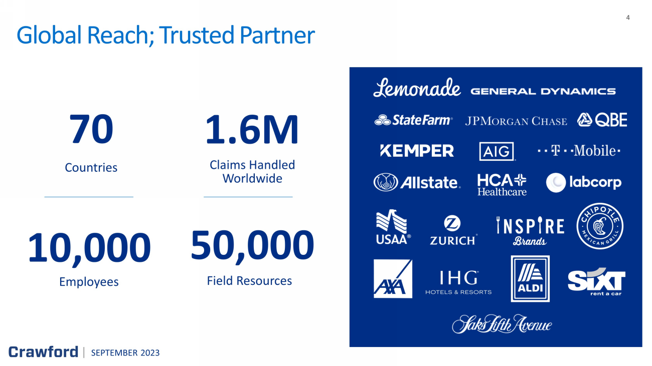 3 3 The world’s largest publicly listed independent provider of global claims management solutions 63% ⎹ US 11% ⎹ UK 7% ⎹ Canada 7% ⎹ Australia 12% ⎹ Rest of the world BY MARKET¹ BY GLOBAL SERVICE LINES 35% ⎹ Corporations 65% ⎹ Carriers 2 0 % ⎹ Platform Solutions (US - only) 30 % ⎹ International Operations 2 6 % ⎹ Broadspire (US - only) 2 4 % ⎹ North America Loss Adjusting BY G EOGRAPHY SEPTEMBER 2023 (1) Reflects FY 2022; figures are approximate