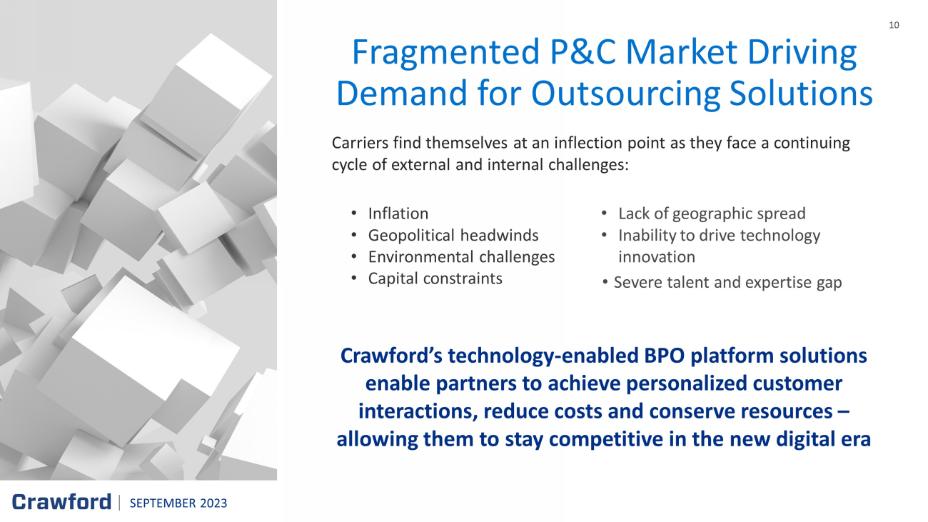 9 $22B Damage from Western and Central drought / heat wave in 2022 2 7.6M U.S. acres burnt by wildfires in 2022 3 $313B 2022 economic losses due to global natural disasters 1 $50 - 55B Insured loss from Hurricane Ian; 2 nd costliest natural disaster for insurers on record 1 More Frequent and Destructive CAT Events Leading to Heightened Insured Losses Lahaina, HI, post - fire, obtained through MAXAR's High - Resolution Satellite Imagery SEPTEMBER 2023 Crawford uniquely positioned as insurance industry seeks cost effective solutions to address surge events that exceed their capacity 1 AON, 2023 Weather, Climate and Catastophe Insight 2 Climate.gov , Beyond the Data, January 2023 3 Congressional research service report, June 2023