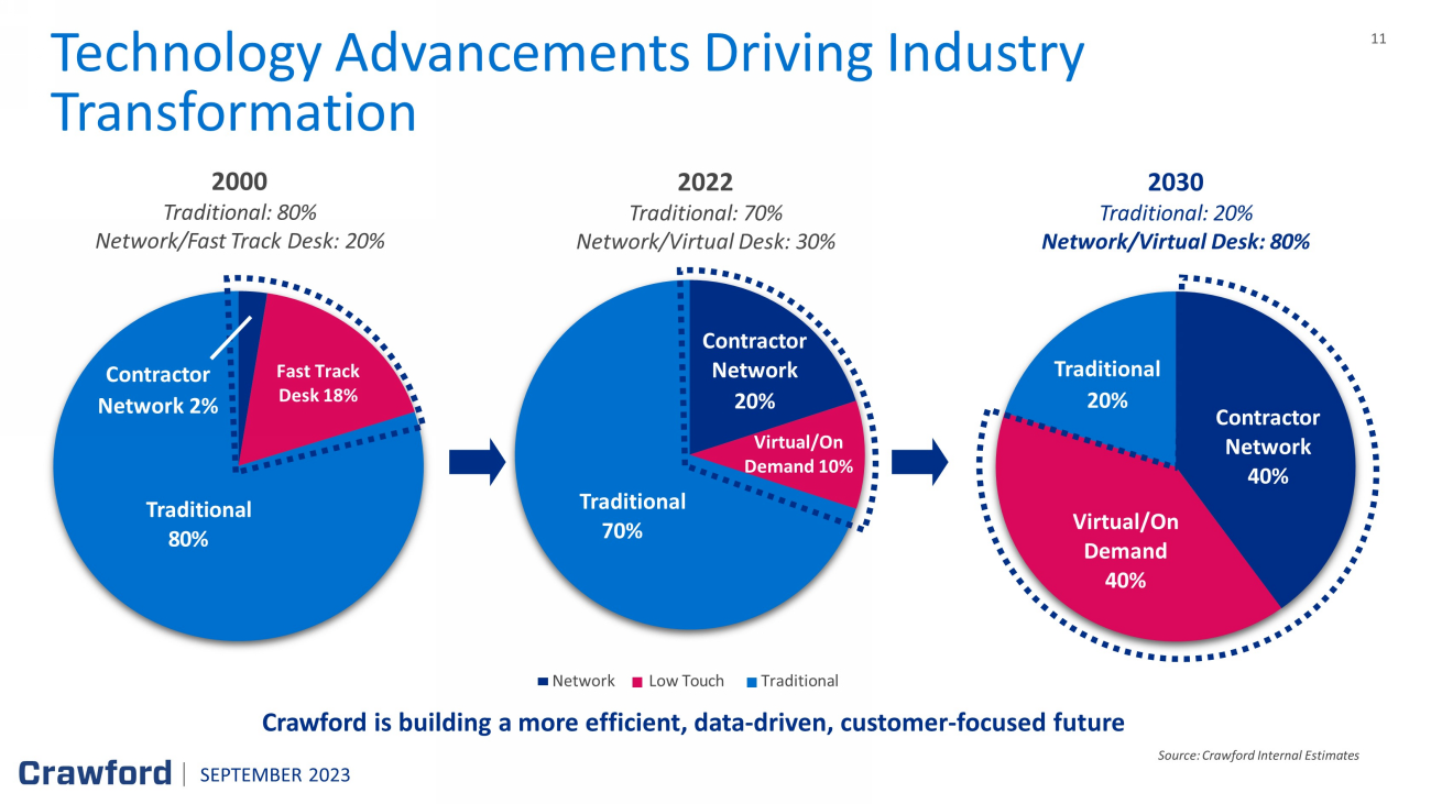 11 Contractor Network 2% Traditional 80% Network Low Touch Traditional 2022 Traditional: 70% Network/Virtual Desk: 30% Contractor Network 40% Virtual/On Demand 40% Traditional 20% 2030 Traditional: 20% Network/Virtual Desk: 80% Source: Crawford Internal Estimates Technology Advancements Driving Industry Transformation Contractor Network 20% Virtual/On Demand 10% Traditional 70% SEPTEMBER 2023 Traditional 8 0% Contractor Network 2% Fast Track Desk 18 % 2000 Traditional: 80% Network/Fast Track Desk: 20% Crawford is building a more efficient, data - driven, customer - focused future