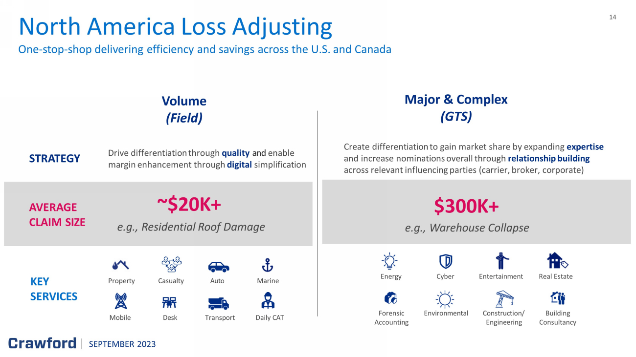 13 13 International Operations Comprised of All Reported Service Lines Outside of North America: • UK • Europe • Australia • Asia • Latin America • Legal Services 30% of YTD revenues Broadspire (U.S. - only) Platform Solutions (U.S. - only) Third Party Administration for: • Workers' Compensation • Auto and Liability • Claims • Medical Management • Disability • RMIS • Accident and Health Service Lines Include: • Contractor Connection • Networks • Catastrophe • WeGoLook • Subrogation (Praxis) Comprised of the Following North American Service Lines: • US GTS • US Field Ops • Canada Loss Adjusting • Canada TPA • Canada Contractor Connection • edjuster North America Loss Adjusting 24% of YTD revenues 26% of YTD revenues 20% of YTD revenues Operating Segments SEPTEMBER 2023