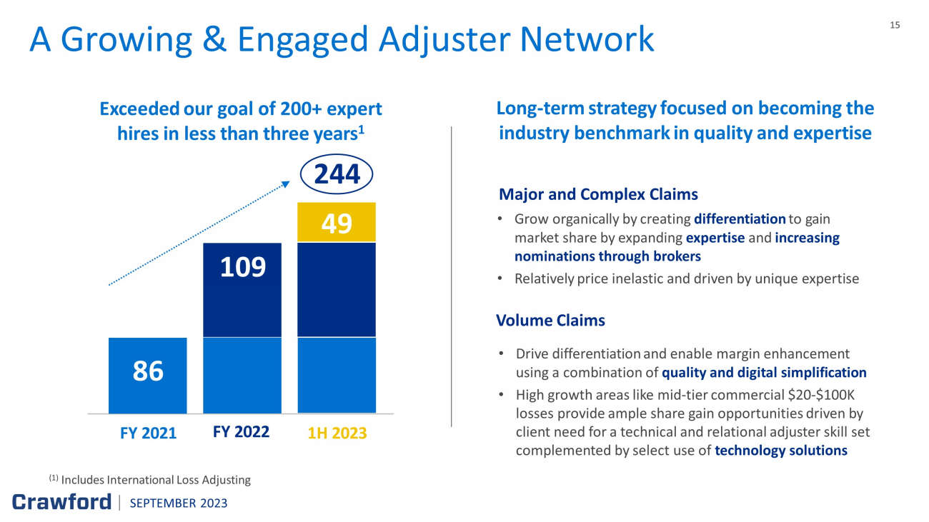 14 O ne - stop - shop delivering efficiency and savings across the U.S. and Canada North America Loss Adjusting STRATEGY Drive differentiation through quality and enable margin enhancement through digital simplification Create differentiation to gain market share by expanding expertise and increase nominations overall through relationship building across relevant influencing parties (carrier, broker, corporate) AVERAGE CLAIM SIZE KEY SERVICES Major & Complex (GTS) Volume (Field) Energy Construction/ Engineering Cyber Real Estate Environmental Forensic Accounting Entertainment Building Consultancy Property Transport Casualty Marine Desk Mobile Auto Daily CAT ~ $ 20 K + e.g., Residential Roof Damage $300K+ e.g., Warehouse Collapse SEPTEMBER 2023