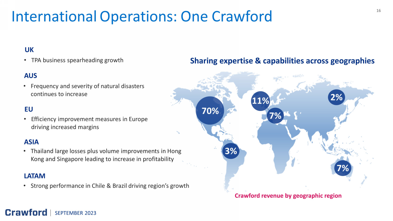 16 International Operations : One Crawford Sharing expertise & capabilities across geographies SEPTEMBER 2023 Crawford revenue by geographic region UK • TPA business spearheading growth AUS • Frequency and severity of natural disasters continues to increase • Efficiency improvement measures in Europe driving increased margins EU • Thailand large losses plus volume improvements in Hong Kong and Singapore leading to increase in profitability ASIA • Strong performance in Chile & Brazil driving region’s growth LATAM 3% 11% 7% 7% 2% 70%