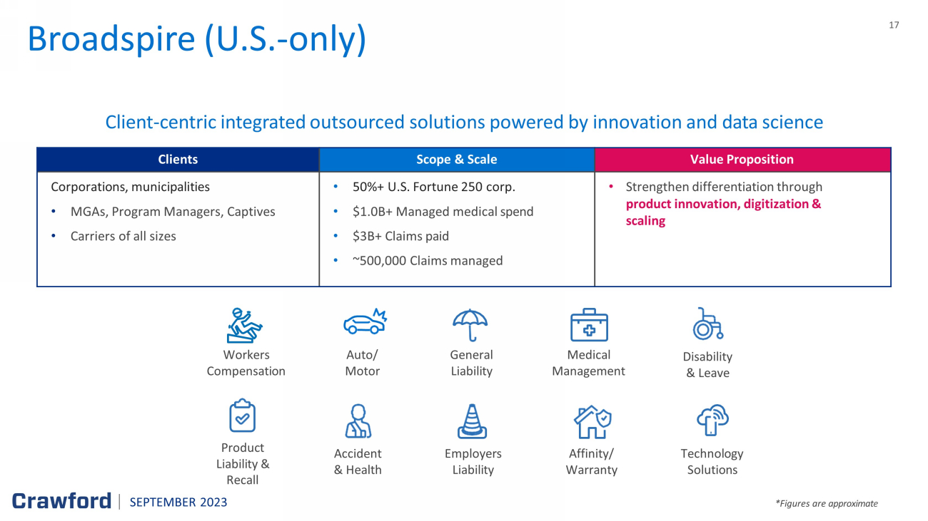 17 * Figures are approximat e C lient - centric integrated outsourced solutions powered by innovation and data science Broadspire (U.S. - only) Clients Scope & Scale Value Proposition Corporations, municipalities • MGAs, Program Managers, Captives • Carriers of all sizes • 50%+ U.S. Fortune 250 corp . • $1.0B+ Managed medical spend • $3B+ Claims paid • ~500,000 Claims managed • Strengthen differentiation through product innovation, digitization & scaling SEPTEMBER 2023 Workers Compensation Auto/ Motor Accident & Health Affinity/ Warranty General Liability Product Liability & Recall Employers Liability Medical Management Disability & Leave Technology Solutions