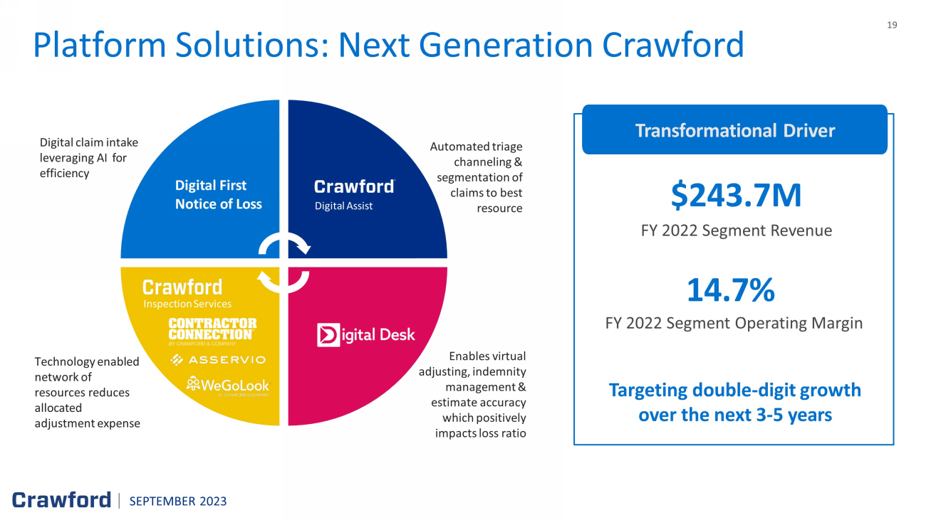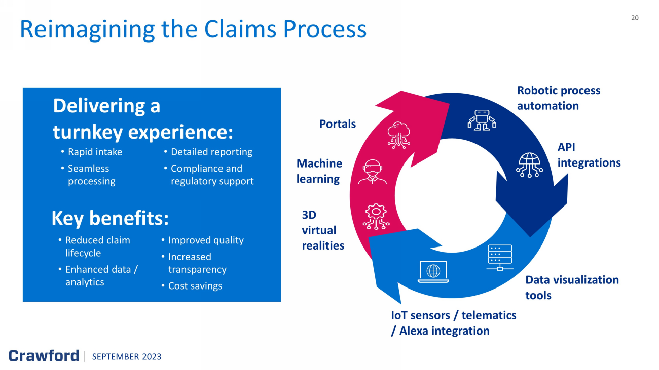 19 Technology enabled network of resources reduces allocated adjustment expense Automated triage channeling & segmentation of claims to best resource E nables virtual adjusting, indemnity management & estimate accuracy which positively impact s loss ratio Digital claim intake leveraging AI for efficiency SEPTEMBER 2023 Platform Solutions : Next Generation Crawford FY 2022 Segment Operating Margin Transformational Driver Targeting double - digit growth over the next 3 - 5 years $243.7M FY 2022 Segment Revenue 14.7% Digital First Notice of Loss Digital Assist Inspection Services