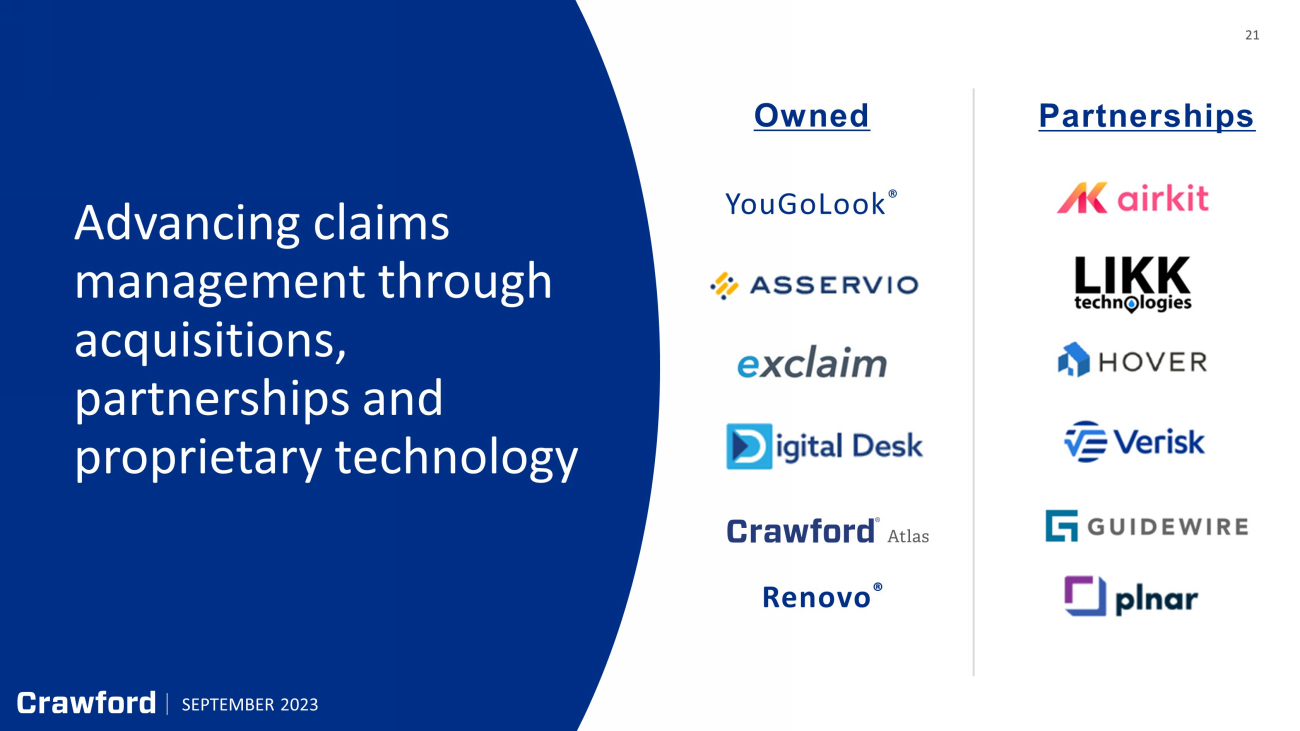 21 21 Advancing claims management through acquisitions, partnerships and proprietary technology Owned YouGoLook ® Partnerships Renovo ® SEPTEMBER 2023