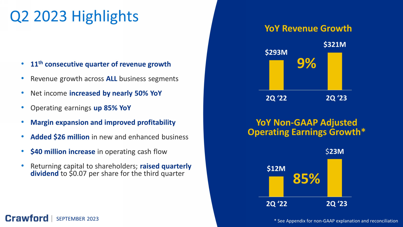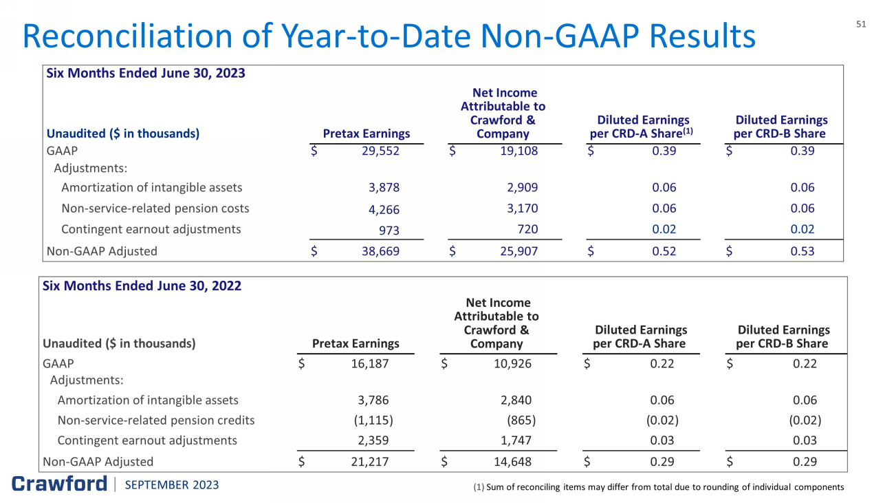 50 50 Reconciliation of 2Q ‘23 Non - GAAP Results Three Months Ended June 30, 2023 Unaudited ($ in thousands) Pretax Earnings Net Income Attributable to Crawford & Company Diluted Earnings per CRD - A Share Diluted Earnings per CRD - B Share GAAP $ 13,551 $ 8,427 $ 0.17 $ 0.17 Adjustments: Amortization of intangible assets 1,979 1,484 0. 03 0. 03 Non - service - related pension costs 2,095 1,557 0.03 0.03 Contingent earnout adjustments 725 537 0.01 0.01 Non - GAAP Adjusted $ 18,350 $ 12,005 $ 0. 24 $ 0. 24 Three Months Ended June 30, 2022 Unaudited ($ in thousands) Pretax Earnings Net Income Attributable to Crawford & Company Diluted Earnings per CRD - A Share (1) Diluted Earnings per CRD - B Share (1) GAAP $ 8,605 $ 5,830 $ 0.12 $ 0.12 Adjustments: Amortization of intangible assets 2,060 1,545 0.03 0.03 Non - service - related pension credits (572 ) (444 ) (0.01 ) (0.01 ) Contingent earnout adjustments 303 224 — — Non - GAAP Adjusted $ 10,396 $ 7,155 $ 0. 15 $ 0.15 (1) Sum of reconciling items may differ from total due to rounding of individual components SEPTEMBER 2023