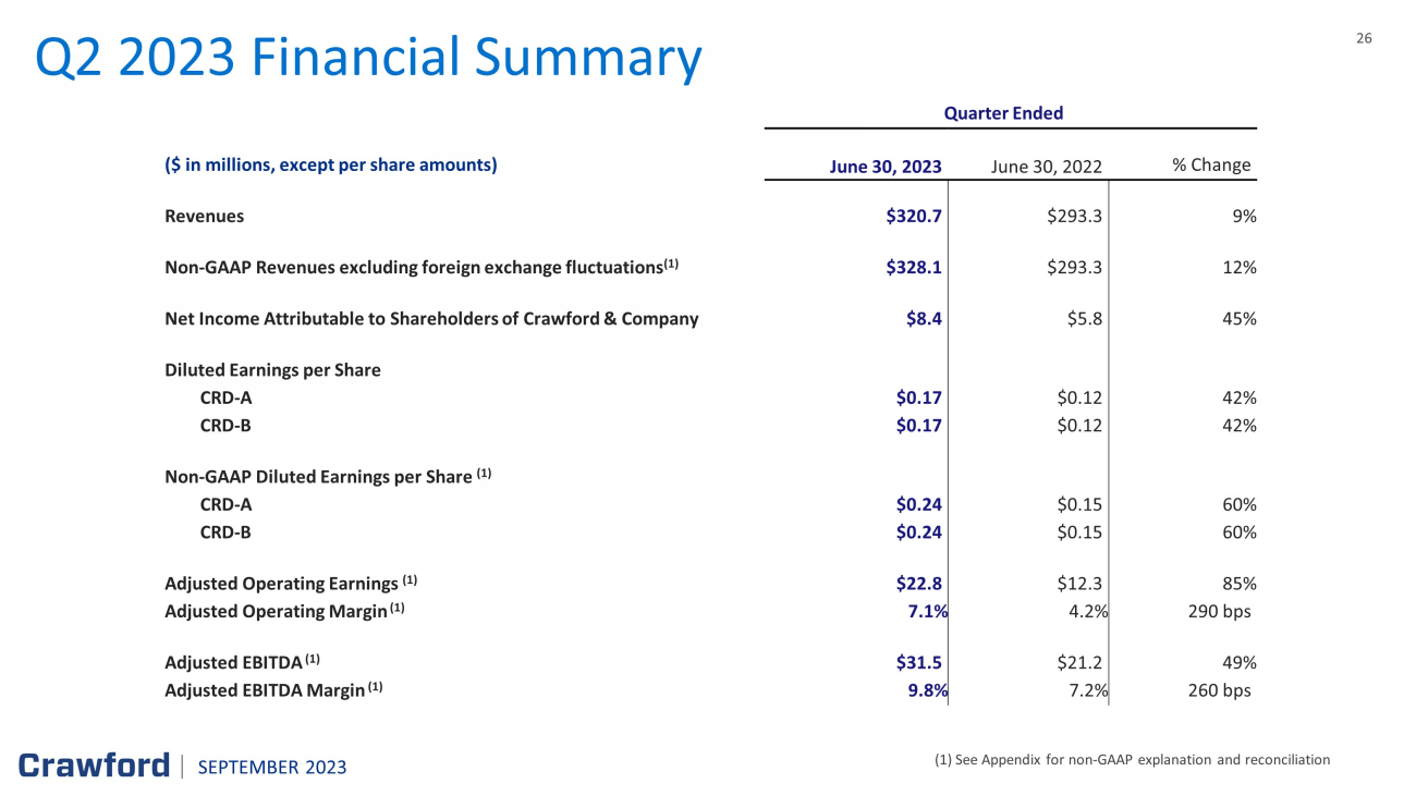 26 26 Q2 2023 Financial Summary (1) See Appendix for non - GAAP explanation and reconciliation Quarter Ended ($ in millions, except per share amounts) June 30 , 2023 June 30 , 2022 % Change Revenues $ 320.7 $ 293.3 9% Non - GAAP Revenues excluding foreign exchange fluctuations (1) $ 328.1 $ 293.3 12% Net Income Attributable to Shareholders of Crawford & Company $ 8.4 $5.8 45% Diluted Earnings per Share CRD - A $ 0.17 $0.12 42% CRD - B $ 0.17 $ 0.12 42% Non - GAAP Diluted Earnings per Share ( 1 ) CRD - A $ 0.24 $ 0.15 60% CRD - B $ 0.24 $ 0.15 60% Adjusted Operating Earnings (1) $ 22.8 $ 12.3 85% Adjusted Operating Margin (1) 7.1 % 4.2 % 290 bps Adjusted EBITDA (1) $ 31.5 $ 21.2 49% Adjusted EBITDA Margin (1) 9.8 % 7.2 % 260 b p s SEPTEMBER 2023