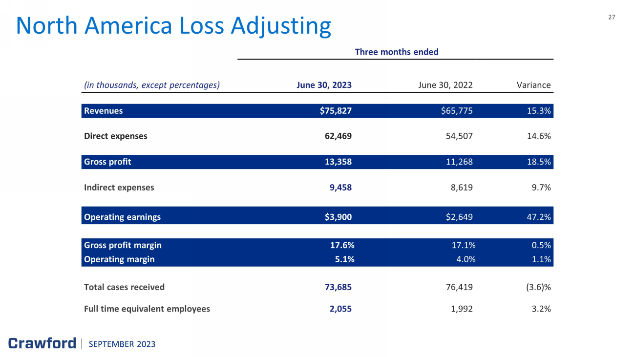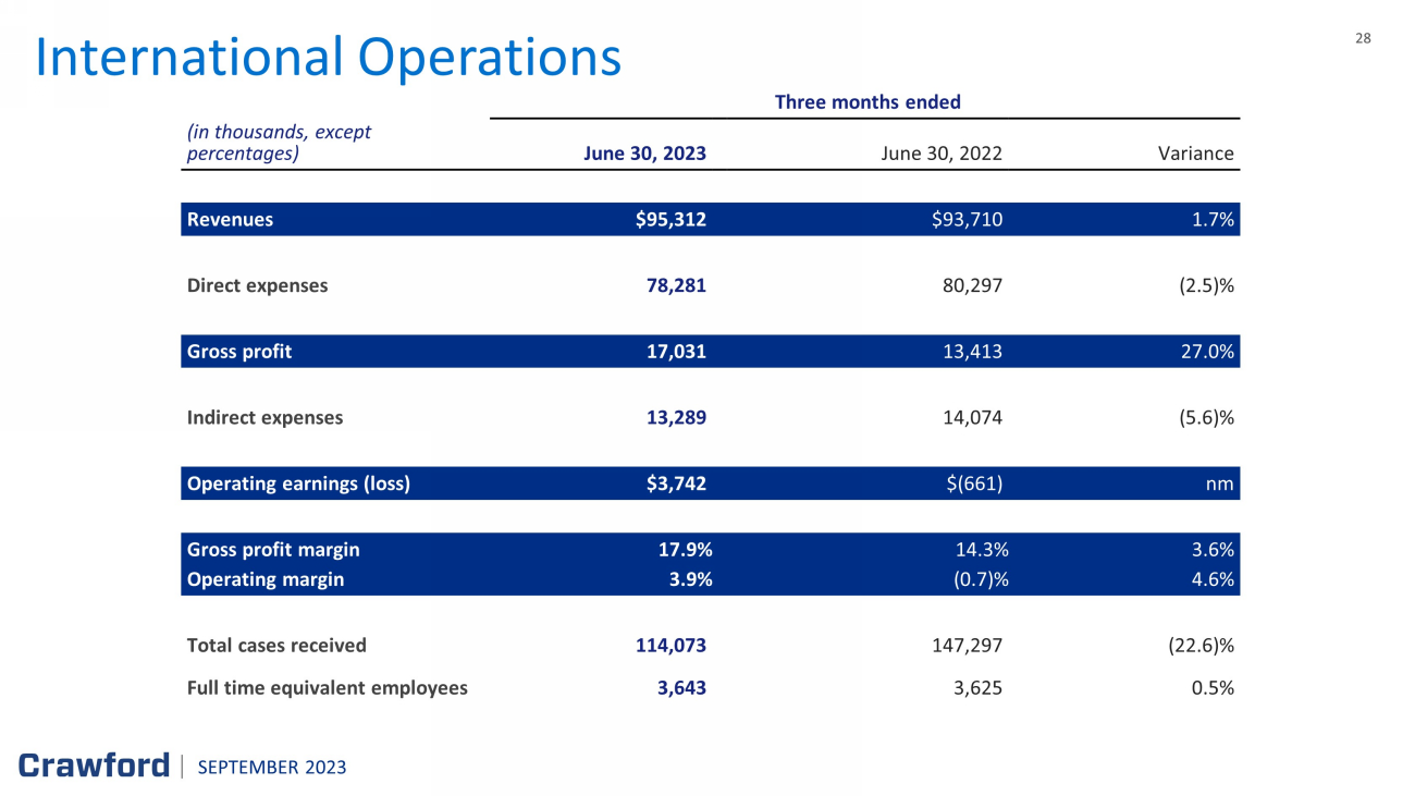 27 27 North America Loss Adjusting Three months ended (in thousands, except percentages) June 30, 2023 June 30, 2022 Variance Revenues $ 75,827 $ 65,775 15.3 % Direct expenses 62,469 54,507 14.6 % Gross profit 13,358 11,268 18.5 % Indirect expenses 9,458 8,619 9.7% Operating earnings $ 3,900 $2,649 47.2% Gross profit margin 17.6% 17.1% 0.5 % Operating margin 5.1% 4.0% 1.1 % Total cases received 73,685 76,419 (3.6) % Full time equivalent employees 2,055 1,992 3.2% SEPTEMBER 2023