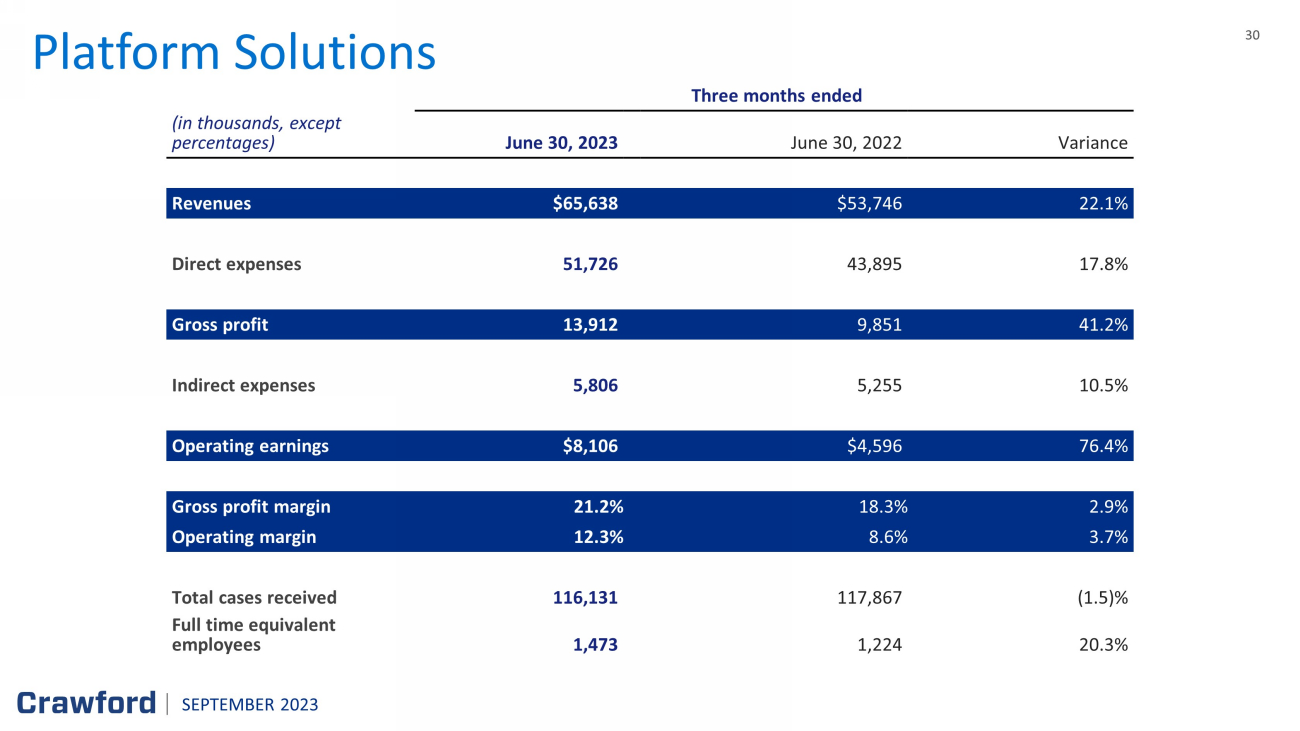 30 30 Platform Solutions Three months ended (in thousands, except percentages) June 30, 2023 June 30, 2022 Variance Revenues $ 65,638 $ 53,746 22.1% Direct expenses 51,726 43,895 17.8% Gross profit 13,912 9,851 41.2% Indirect expenses 5,806 5,255 10.5% Operating earnings $ 8,106 $ 4,596 76.4 % Gross profit margin 21.2% 18.3% 2.9 % Operating margin 12.3% 8.6% 3.7 % Total cases received 116,131 117,867 (1.5)% Full time equivalent employees 1,473 1,224 20.3 % SEPTEMBER 2023